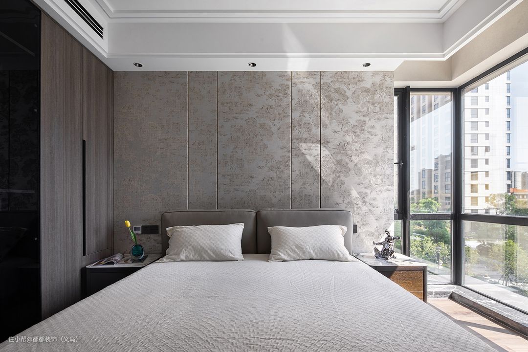 长辈房的整体空间设计比较简单没有过多和复杂的造型,尽量简单简洁为出发点,全屋米色的空间舒适又温馨,定制衣柜采用玻璃门设计,储物收纳一点没少。
