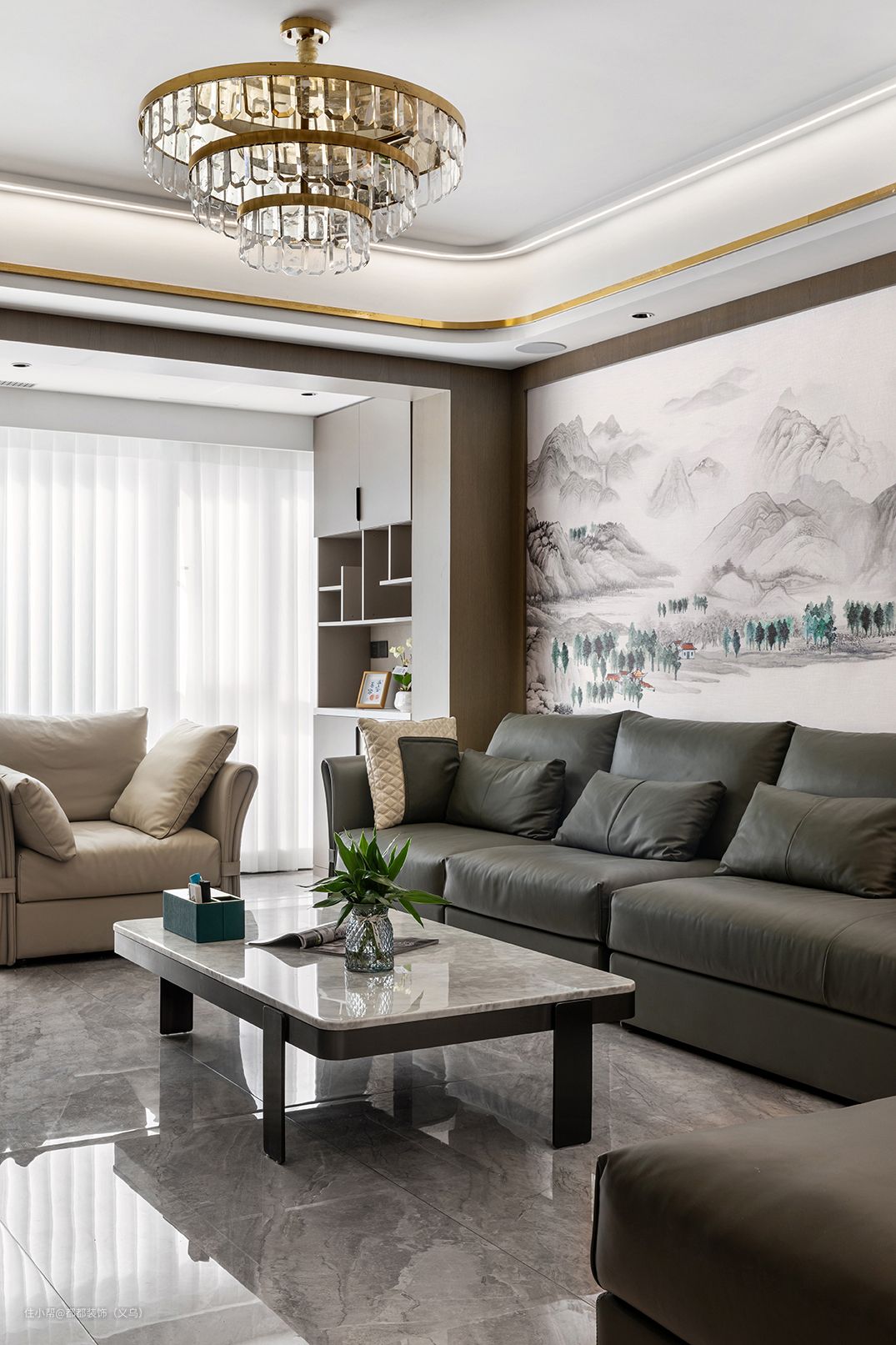 想要给客厅营造一个既现代又文艺的氛围感,不妨试试将山水画搬上背景墙吧!这不仅是独特的视觉享受,还让整个家具有满满的文化气息。