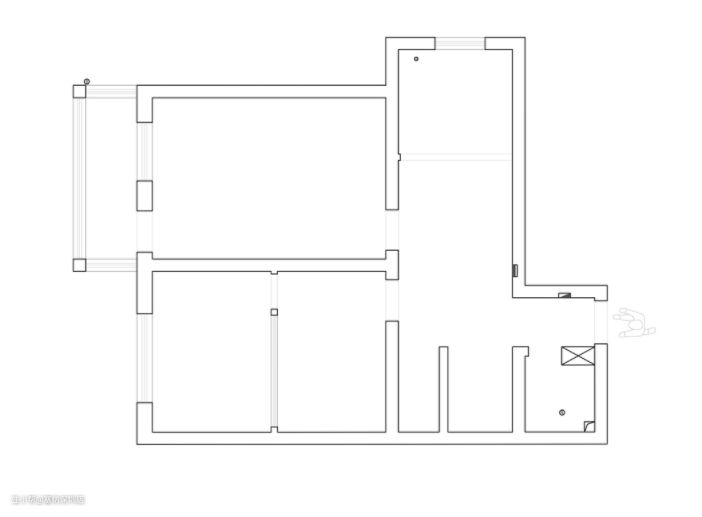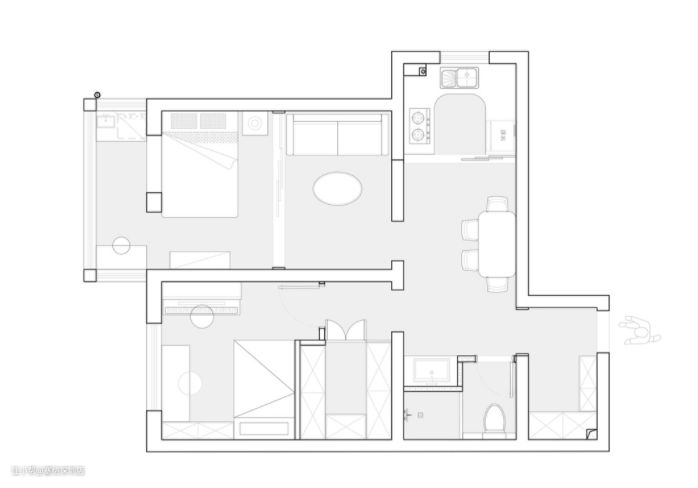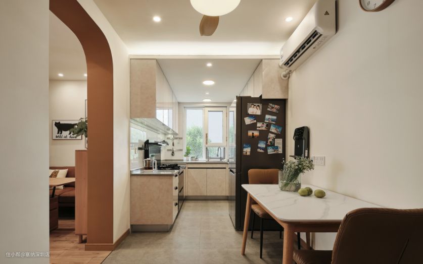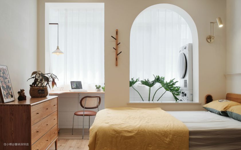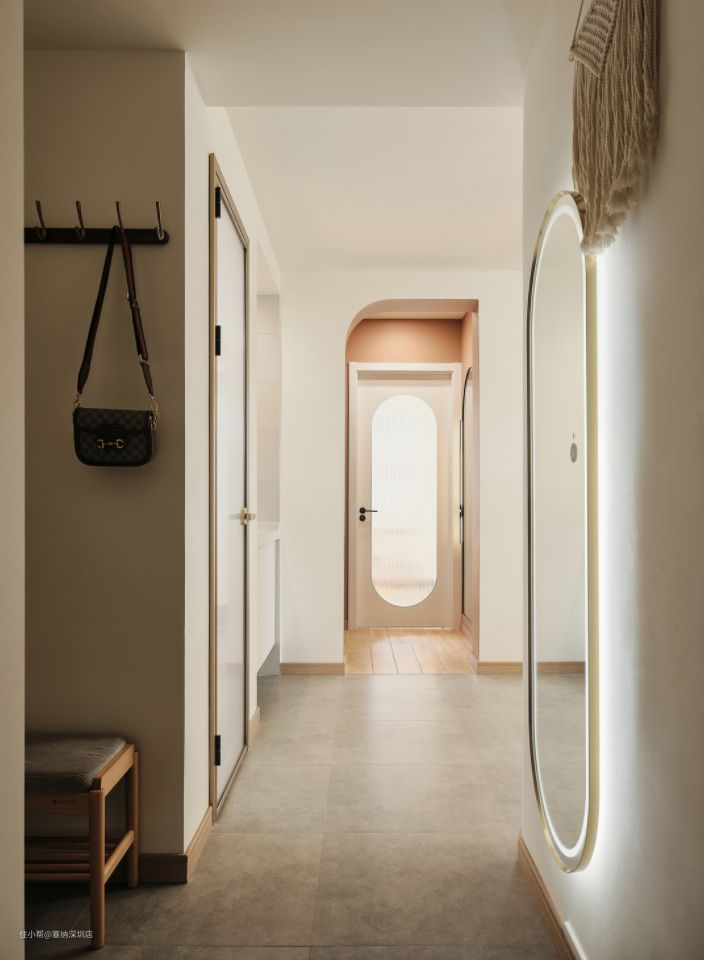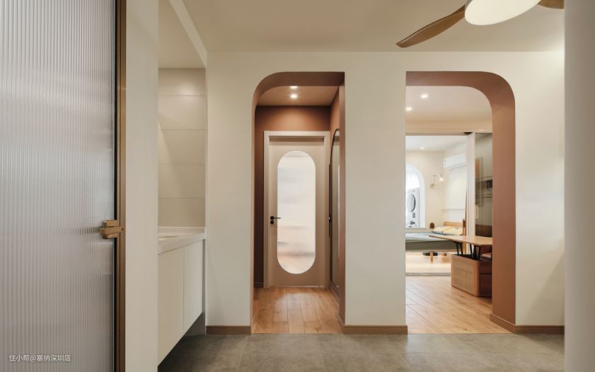 小空间我们把家里尽可能打开,两面弧型门洞各自通往小朋友房间和主卧室房间,干区设在外面,长虹玻璃门里面是马桶区和淋浴区。