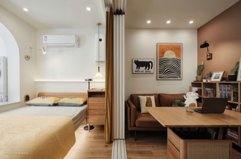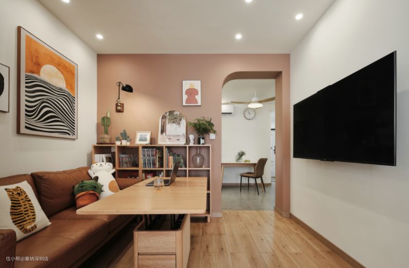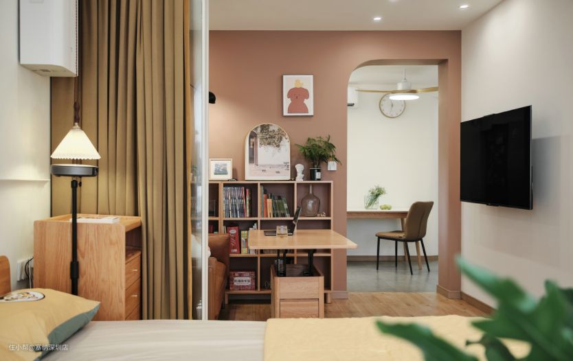 主卧划分出一间多功能客厅,解决了原来的老房没有客厅的问题,也让一家人拥有一个舒适的互动区域。这里既可以作为一家人休闲娱乐的客厅,也是父母办公的书房,孩子也可以在这里阅读绘本或者上网课等,这里可以伴随着家人需求灵活变化。