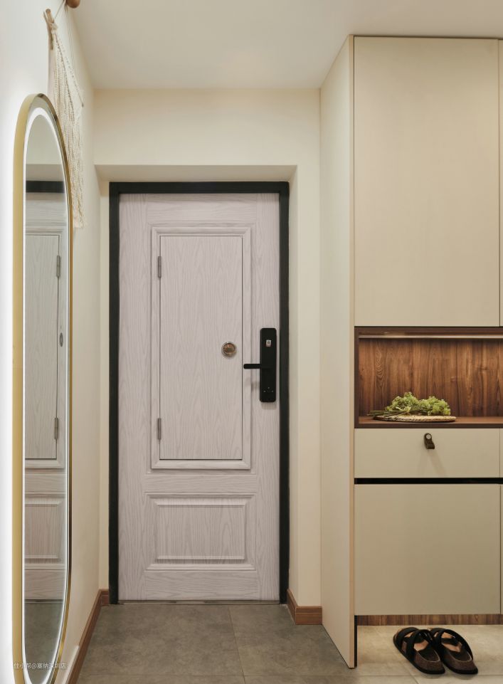 玄关进出家门视角,入户镜、鞋柜、换鞋凳、挂钩等组合,简约组合很实用。
