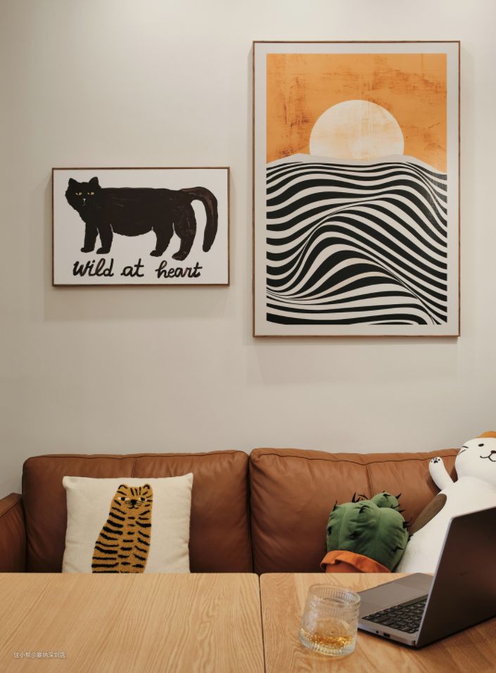 橙色皮质沙发,木色书桌,把这个空间营造的很温馨。