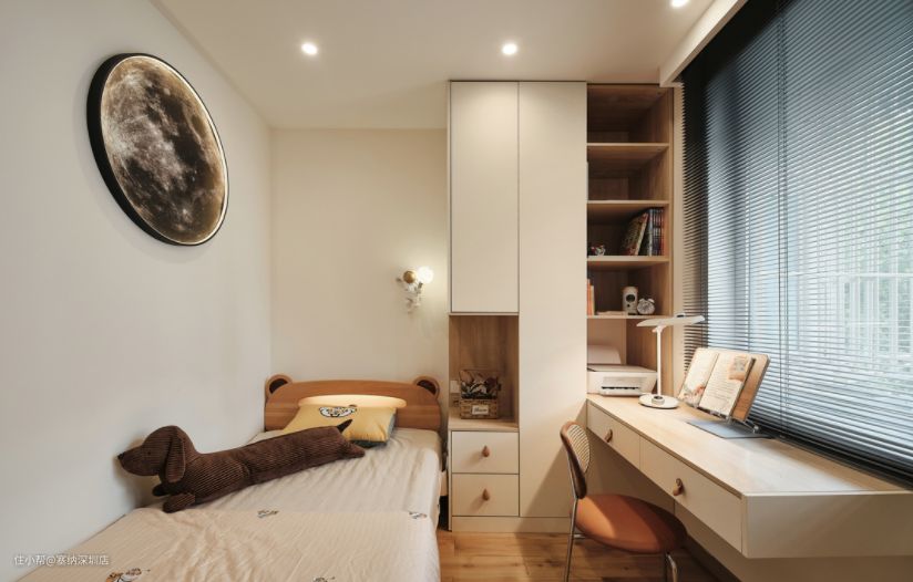 儿童房内部布局,一张儿童房,书桌衣柜一体化,满足小朋友生活学习。