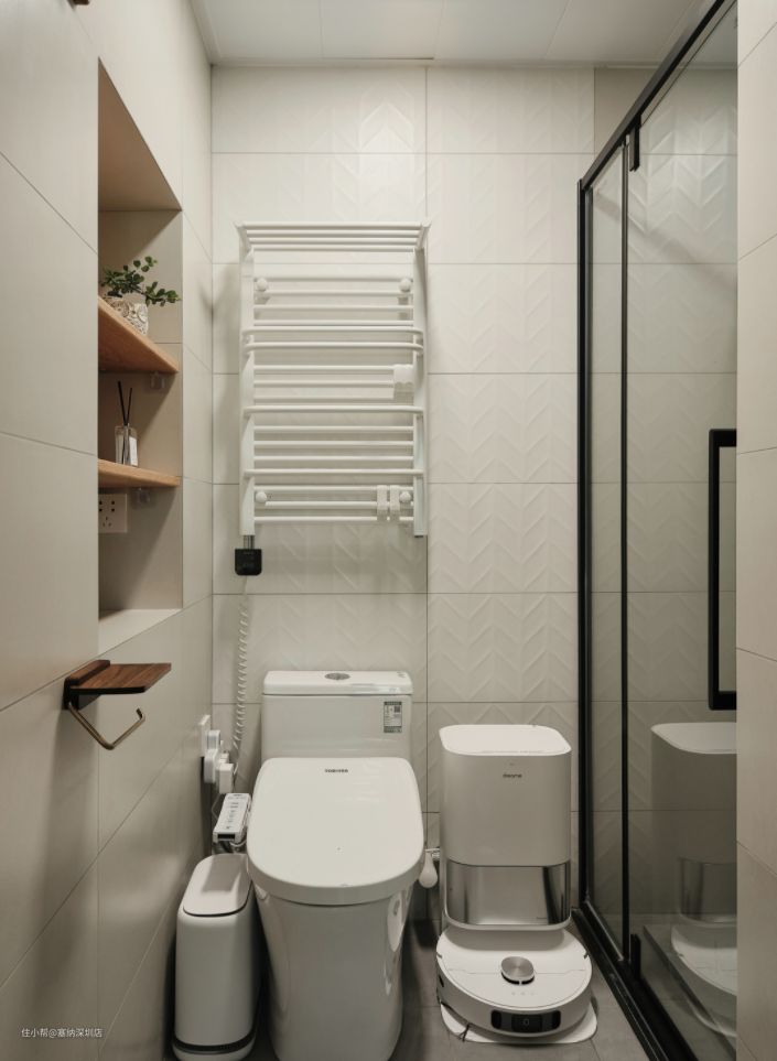 卫生间内部除了马桶区和淋浴房,还设计了壁龛储物空间,挂钩和电热衣架让小空间更舒适。