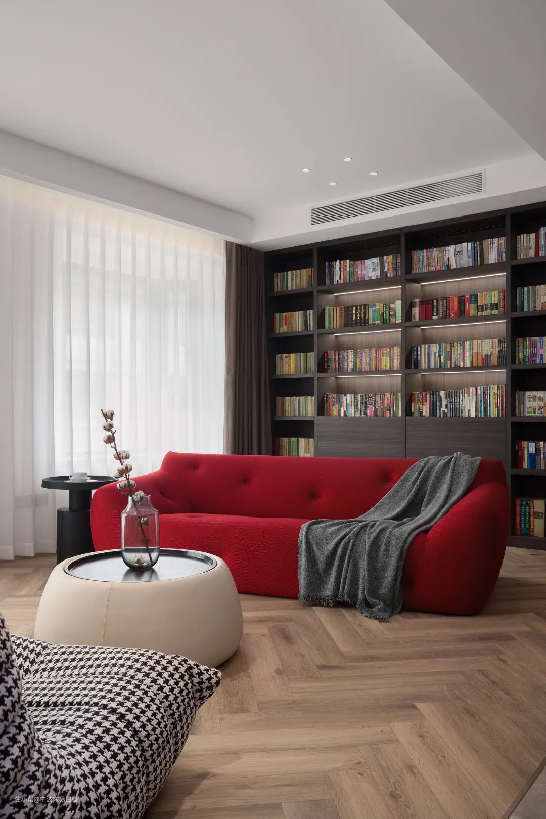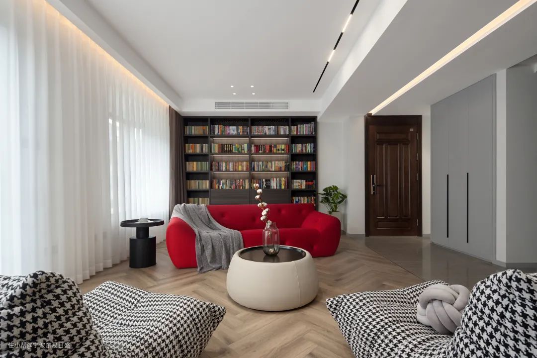 进门玄关处靠墙设立整墙仿古书柜,中间放红色沙发,搭配千鸟格单座,呈现出围炉夜话的家庭聚会场景。