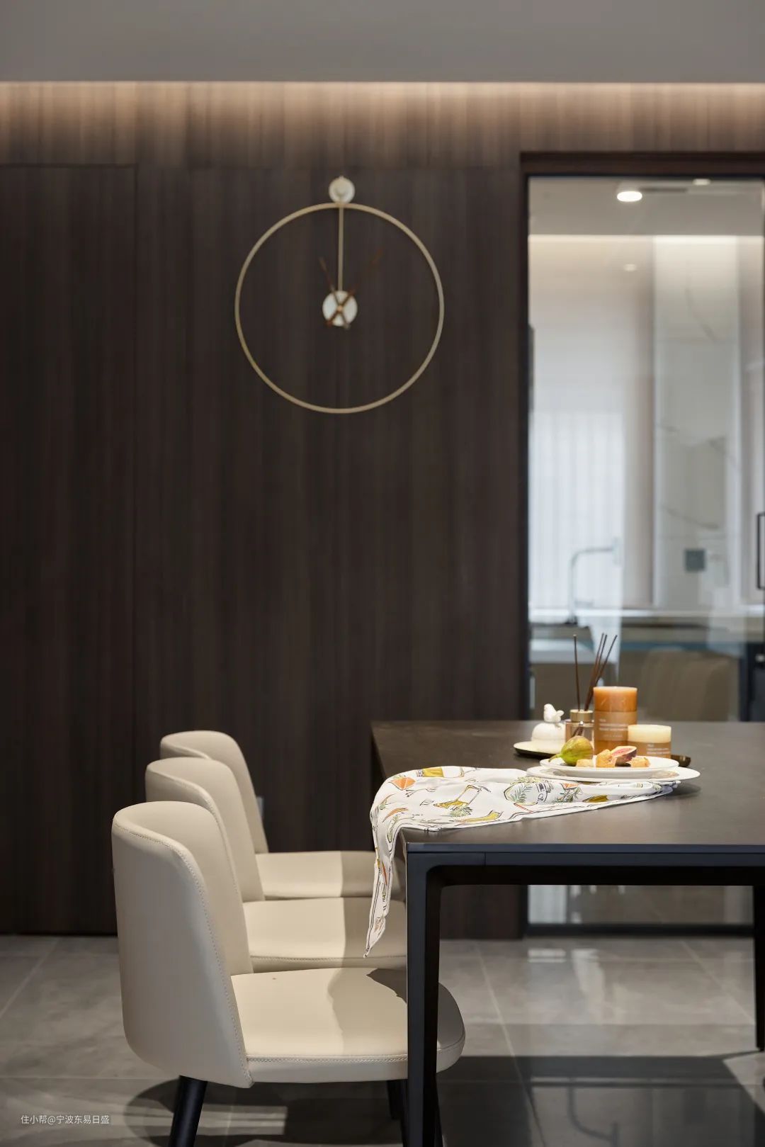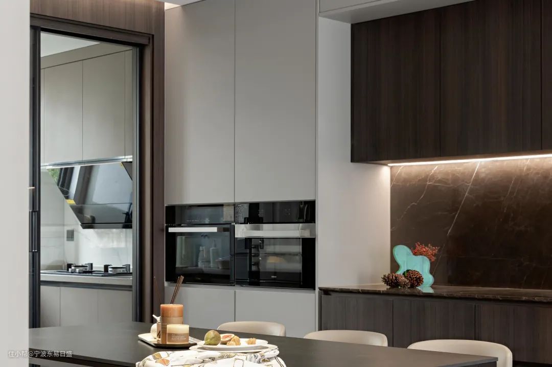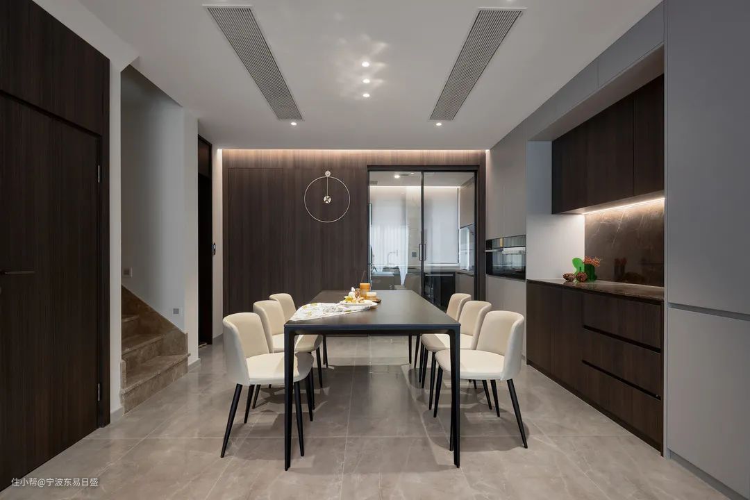 通过对称轴线,餐厅与客厅、厨房分别做全开放式与半开放式设计,同样的深色墙面与柜体以户型墙体呈折型装饰,正中间的餐厅采用了法式特有的白色皮质,冷静黑与温柔白的搭配,佐以星点灯光灯带,高级感拉满。