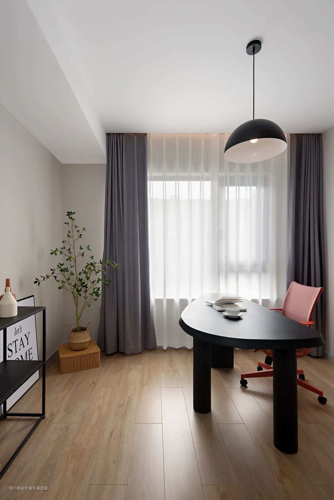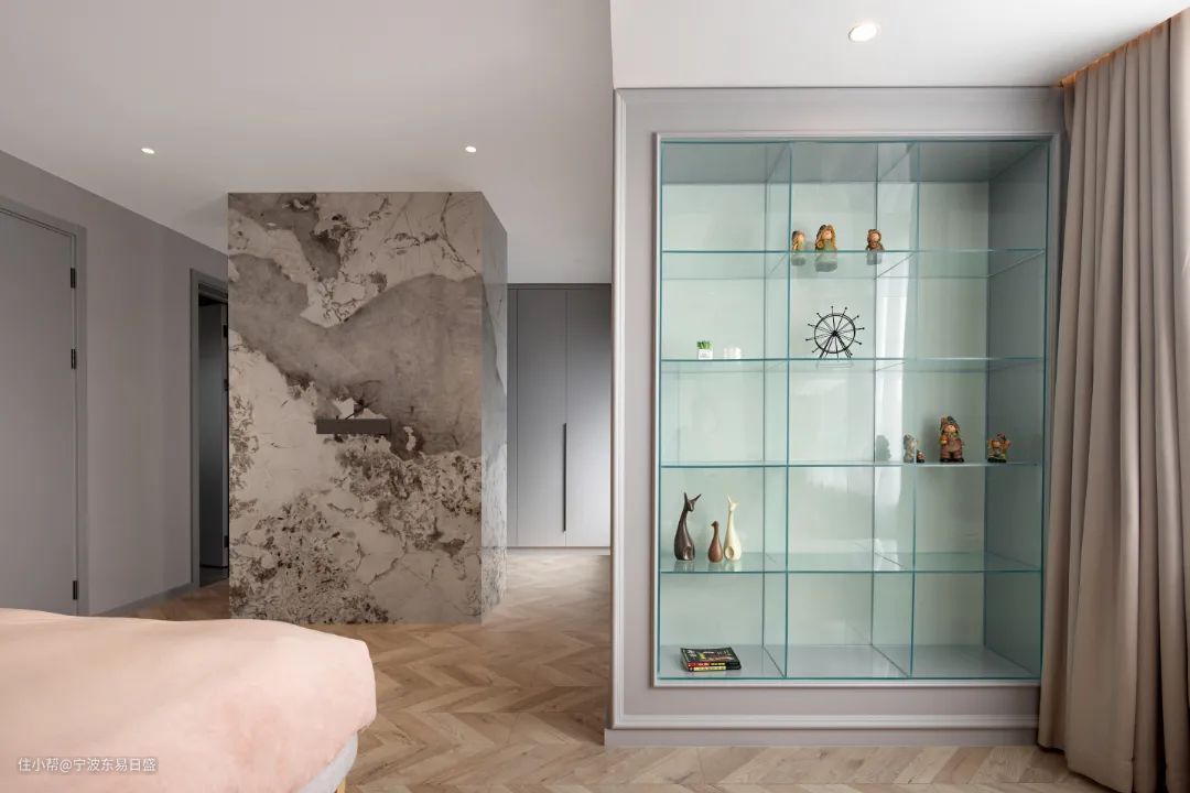 考虑到生活习惯,客厅并未设置电视背景墙,而是在灰色墙面中央设计了内嵌式的休闲台,围合式的沙发布局,为一家人提供更亲密的互动空间。