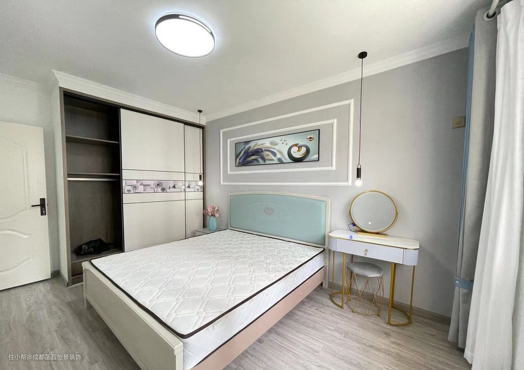 主卧的空间中,在床头的两侧加入吊灯的设计,满足不同时间的照明需求,一侧的区域加入梳妆台的设计,满足女主人的使用,推拉门的设计,节省部分的活动空间。