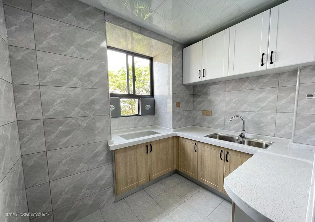 厨房的空间做的是U型的布局,灰色调的墙面砖搭配着白色的台面与吊柜,营造出一个整洁有序的空间。