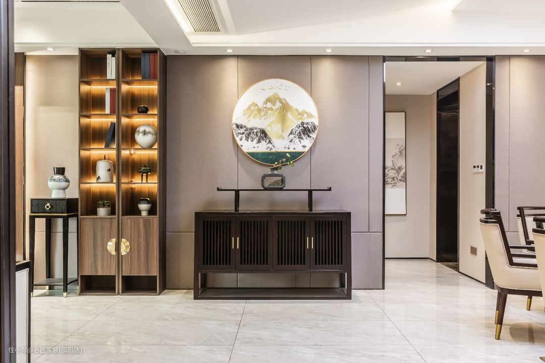△ 在客厅到餐厅的中间做了一个收纳柜,为了最大化的利用把收纳柜做了隔断的处理方式,这里比较细节的一点是设计师在每个格子后方都放入了氛围灯,者也成了整个客厅的点睛之笔,初次之外在收纳柜的旁边做了一幅山水画用来装饰过道,下方的边几也能进行一些小物品的收纳。
