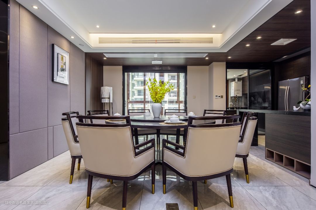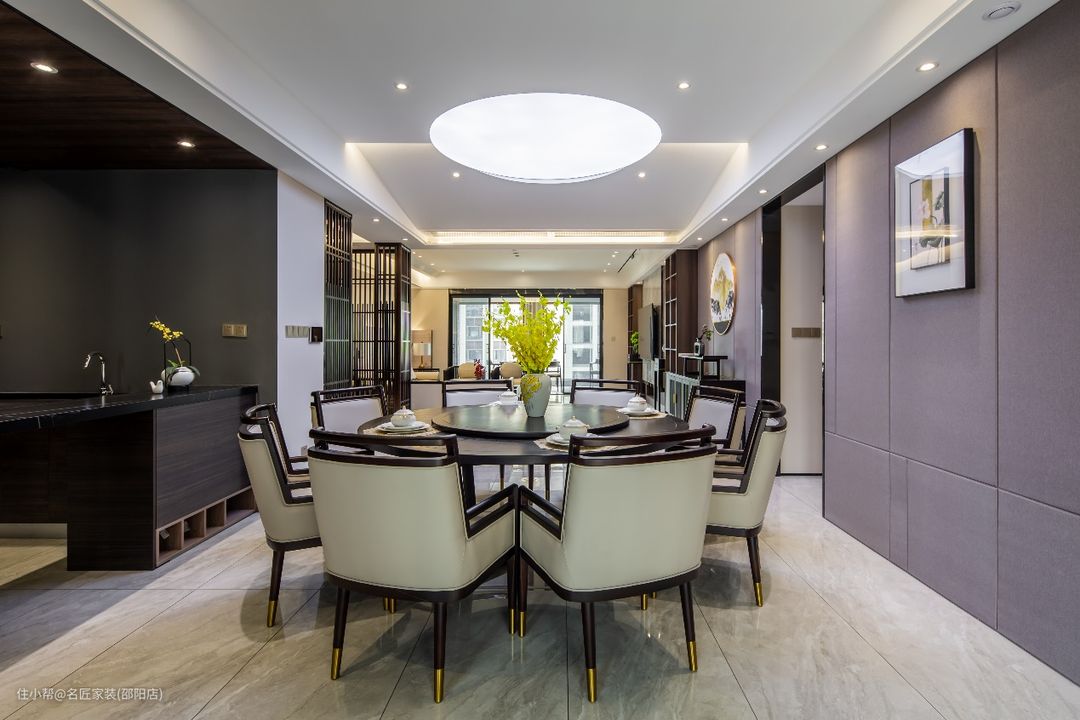 △ 餐厅的面积非常的宽敞,所以就采用了一个圆形的餐桌来进行布局,这样整体看起来会更有层次感一些,而且在旁边的墙壁上是放置了一幅装饰画来进行点缀,餐厅也是采用了无主灯色设计,让整体的空间氛围会更温馨一些。