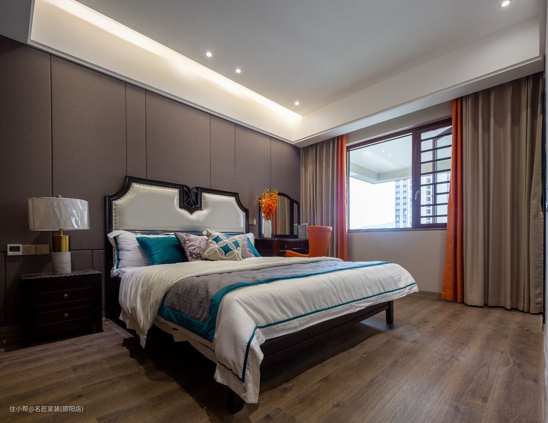 △ 采用软装灰色背景与木制地板,和整体的木质感更搭配。床头老式梳妆台与床头柜相得益彰,栅格式的窗子也彰显了几分中式风格。整个空间的点睛之笔,当属于橙色,窗帘和座椅的橙色为空间注入活力,当然这里也相当于是女屋主的一个梳妆台,镜子的形状也融入了一些中式元素进去的。