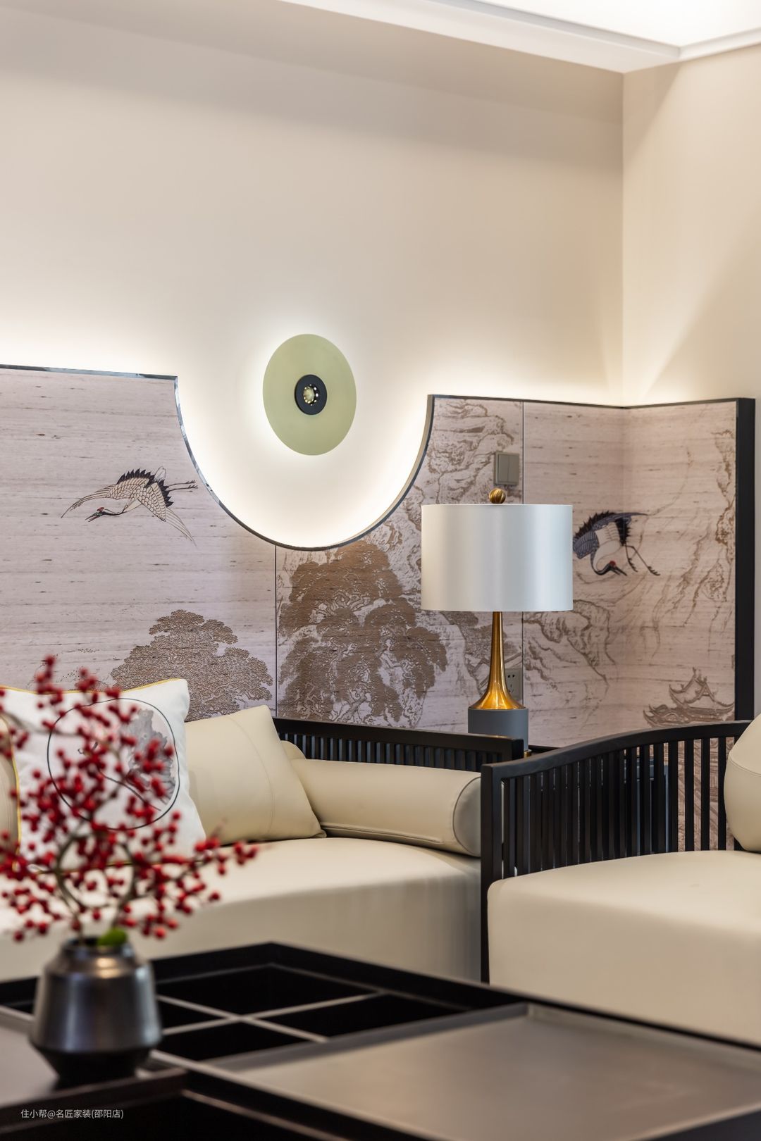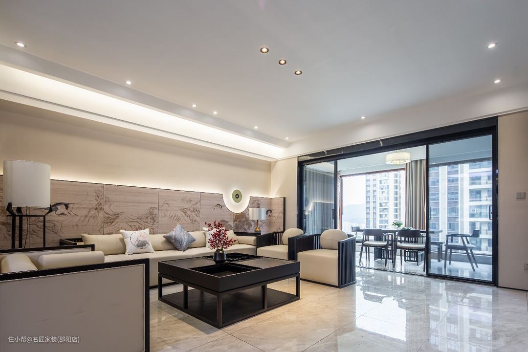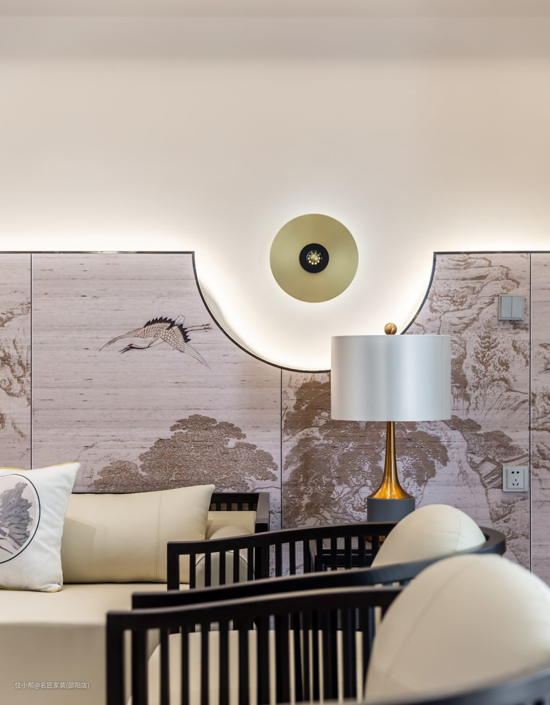 △ 客厅沙发是做了一个U型的布局,沙发的颜色是采用了米色+黑色围栏的布局方式两者搭配很和谐。背景墙为了不显得单调一些做了一个护墙的布局方式,护墙的设计融入了一些中式的元素进行点缀,让整体的空间更加的温馨。客厅中间的茶几采用的是全黑色的田字形茶几,让真个空间又增加了几分厚重感。沙发边台灯一边采用老式风格,一边采用现代风格,两种风格碰撞在一起却不突兀。