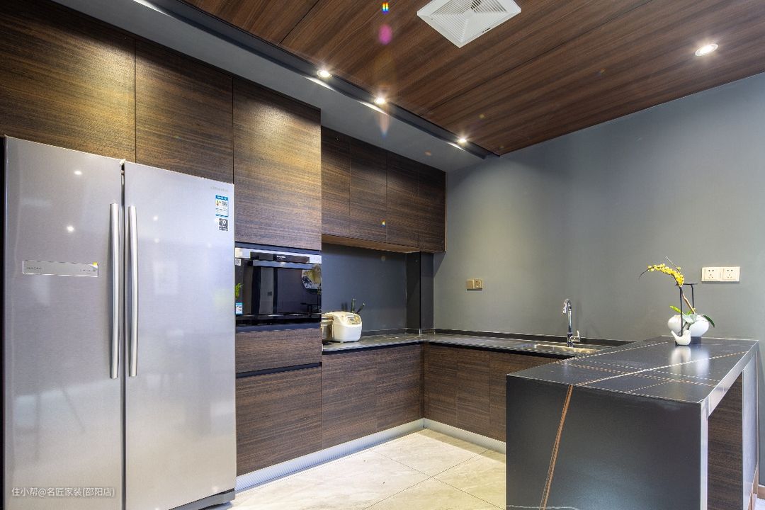 △ 厨房是采用了半开放式的布局方式,以黑灰色为装饰主调,沉稳内敛的同时用于厨房更耐脏实用。角落使用的几组小圆灯,确保照明无死角,给业主更好的使用体验。大理石餐吧的使用也有所考究,整体的黑色台面加上少许花纹的点缀,配合台面的中式插画。将自然趣味搬进了室内,有一种闲适的悠然感,嵌入式烤箱和冰箱节约了更多的空间,整体干净整洁。厨房使用动线合理,让做饭也成为一种享受。