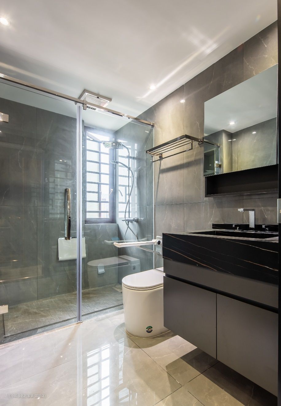 △ 卫生间采用了干湿分离的布局方式,整体感觉比较现代化,两种颜色的瓷砖丰富整体空间。采用比较干净卫生的干湿分离形式,黑色石纹的洗手台面奢华低调,柜体收纳也不错。
