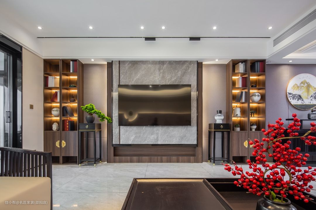 △ 电视背景墙以木质元素打底大理石材质在上的布局方式。电视背景墙没做太的原因就是客厅的整个空间的面积是很大的,如果做一整面背景墙的话不仅空间没有层次感,看久了还会觉得单调。所以在这里设计师就用来两个到顶的艺术柜来代替,能有效的增加整体空间的层次感,还能进行收纳这样的设计才是“两全其美”的。