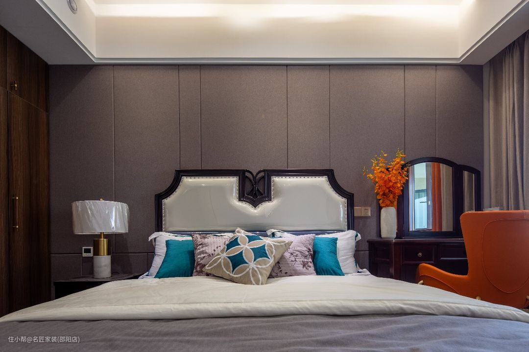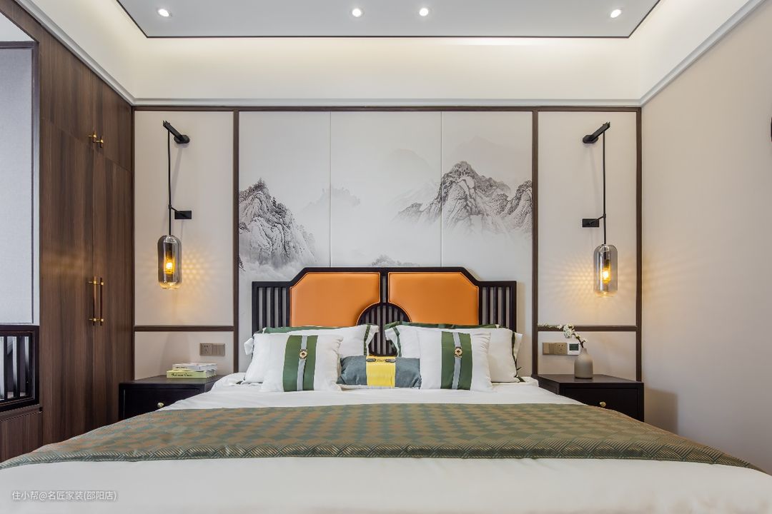 △ 另一间次卧的整体面积也是非常的宽敞的,阳台是整个空间的一个小亮点,因为采光是足够的,为了避免空间的浪费就多做了一个休息的空间,而且在床头的位置是融合了木质元素的材料做了一个通顶的收纳柜,能解决基本的收纳问题。主床头的后方是采用了山水画为背景墙搭配着两盏圆形的吊灯更能衬托出中式的意境氛围。在床头的两侧是采用了黑色木质的床头柜来点缀整个空间,当然也能进行小物品的收纳。