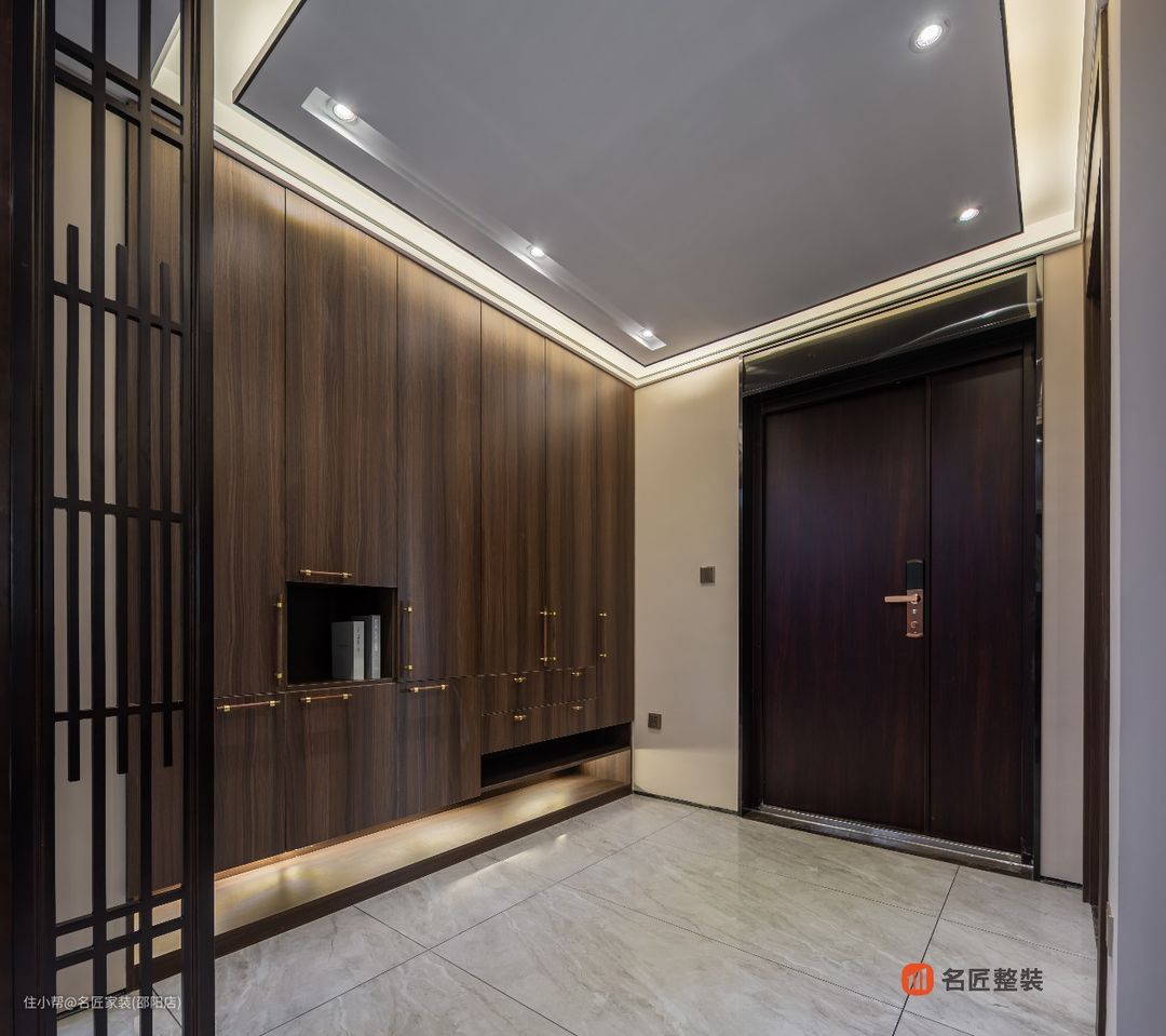 △ 在入户的玄关区域设计师是做了一个玄关柜的布局,没有做到底的柜体设计是为了保证美观性,其次下方保留的空间可以供业主进行鞋子的置放,设计师在玄关柜中间是做了一个镂空的设计是为了让整面玄关柜不显得的“呆板”而做的一个小细节。
