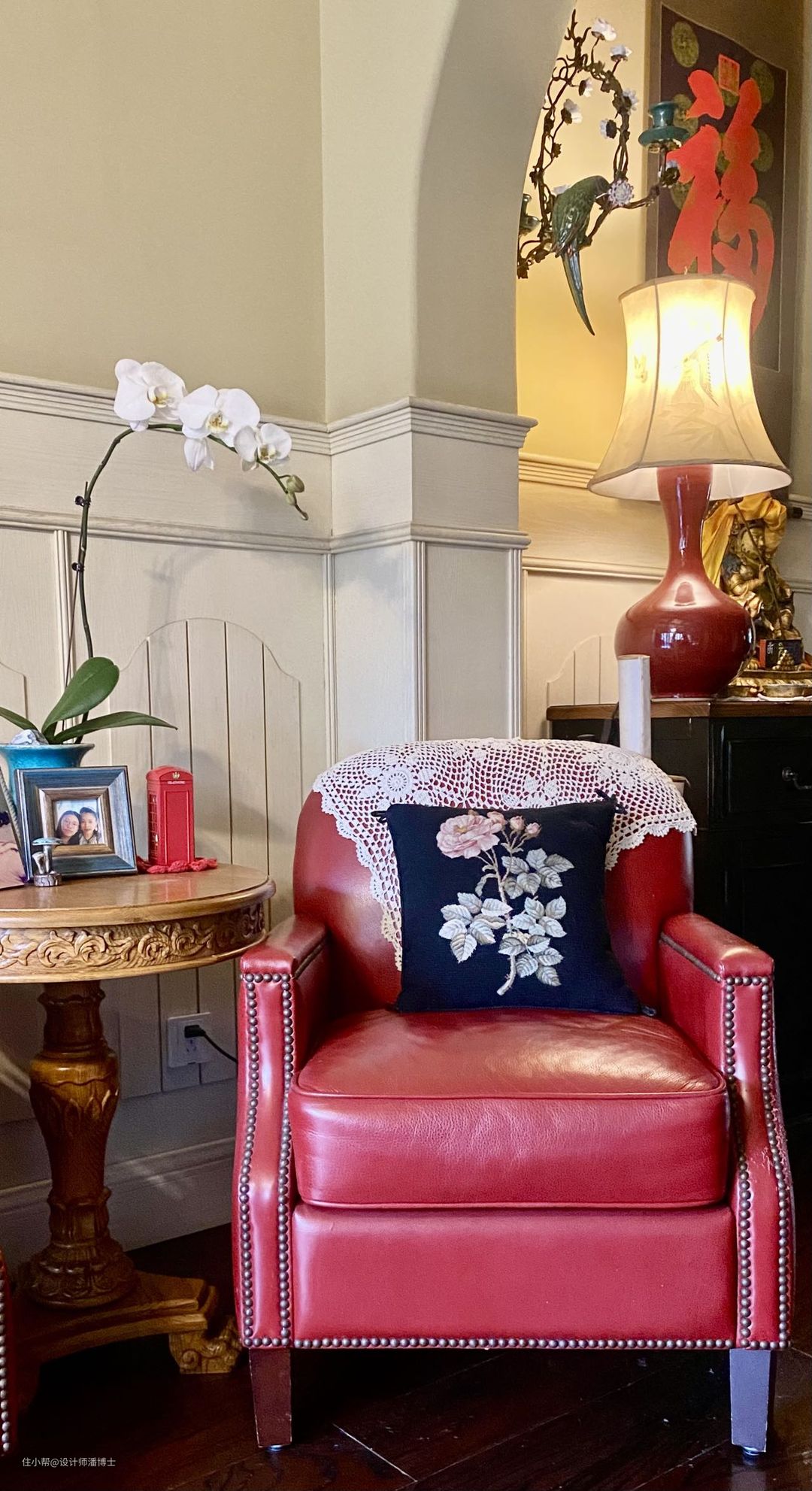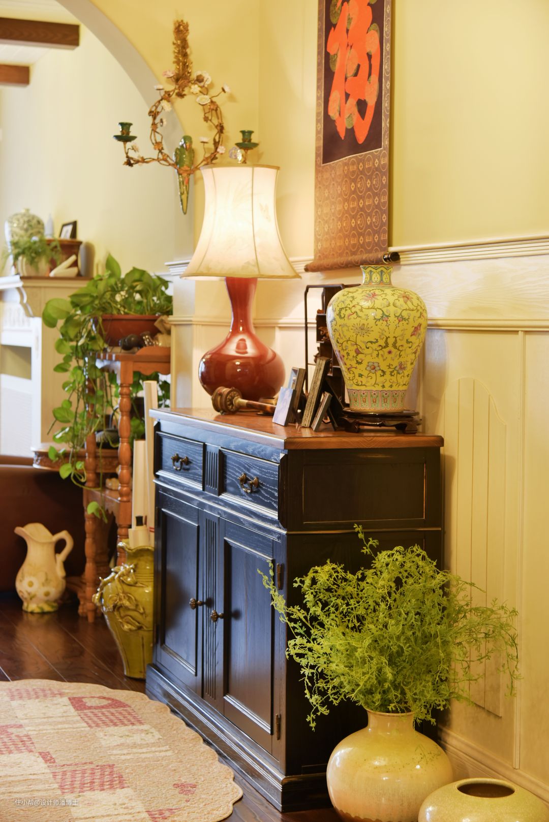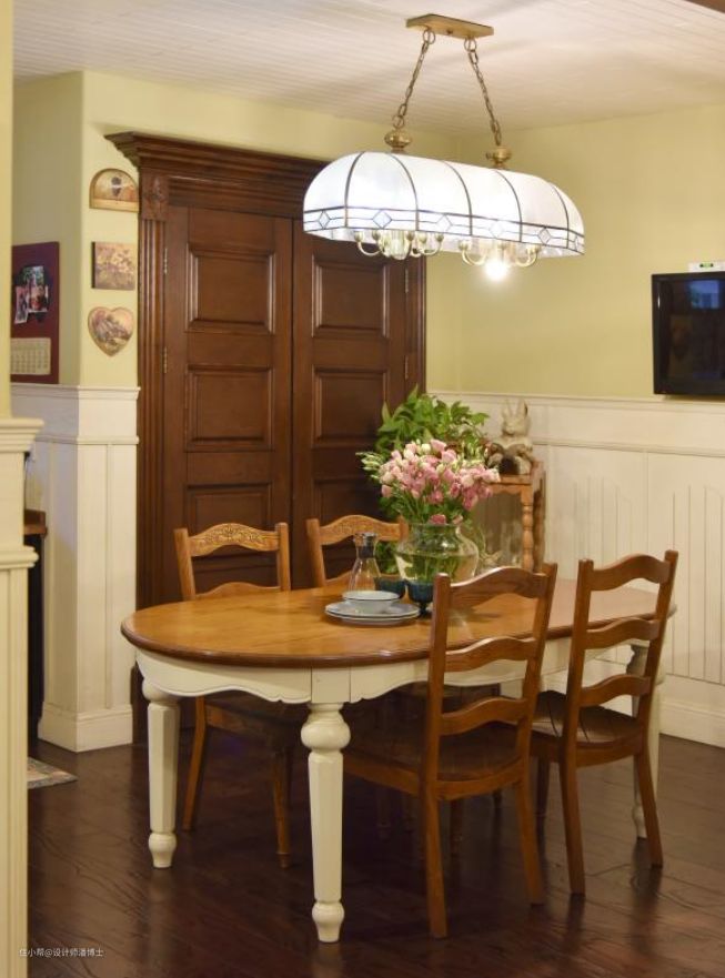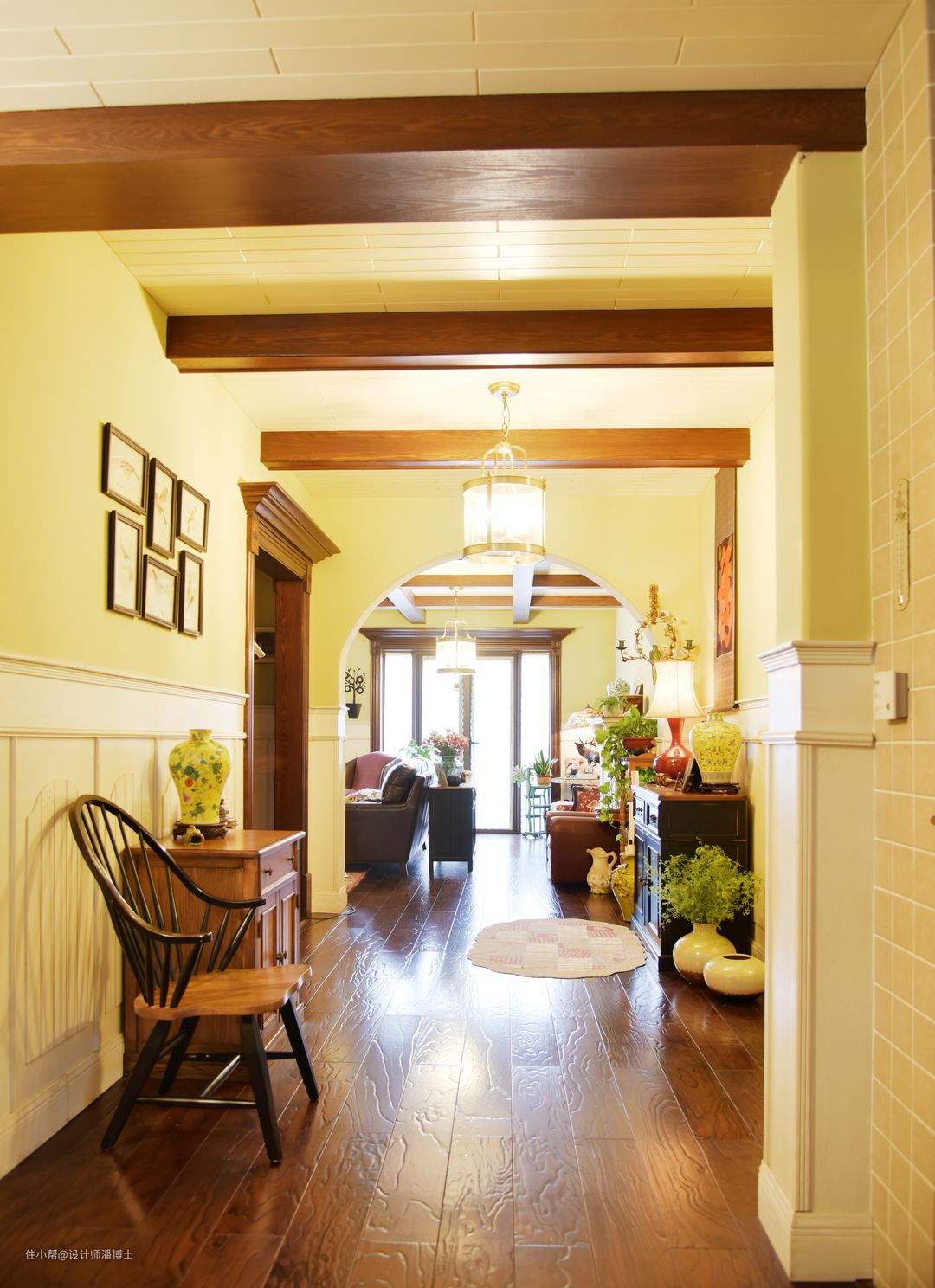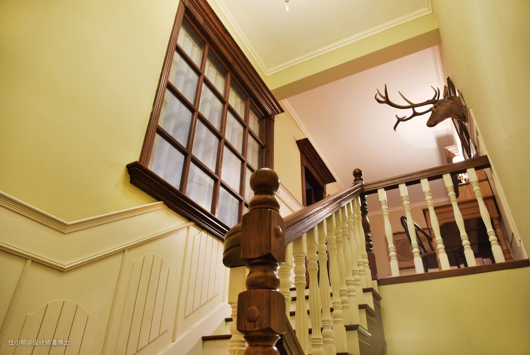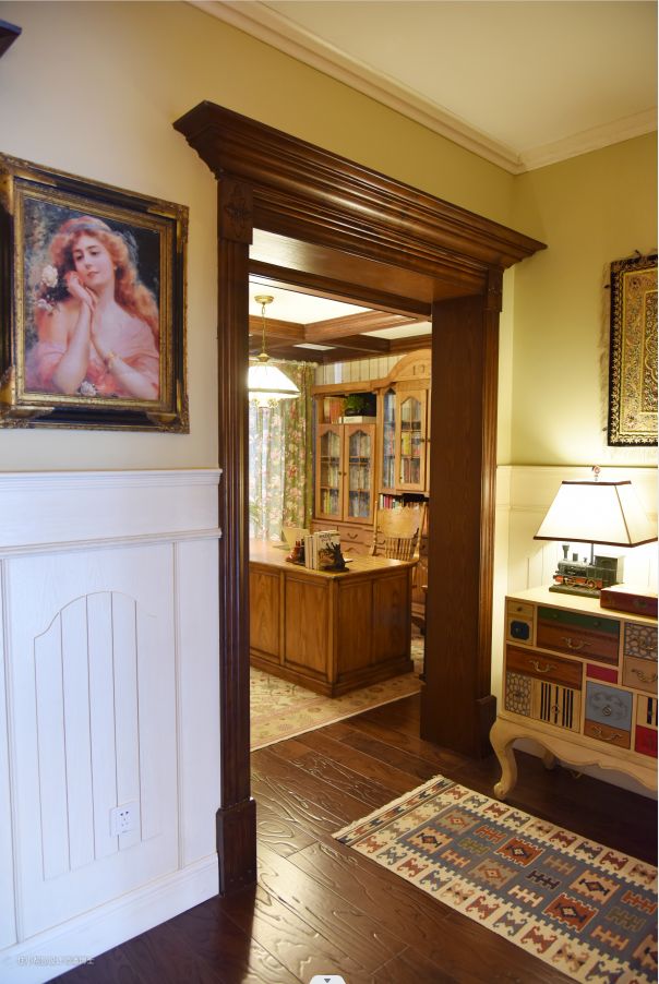 原入户开门就将整个一层看了个通透,通过门厅的隔断,一层空间明确了客厅、餐厅和客房的动线。厚重的门套线条和木梁,既表现了实木质感的硬朗又不失自然材质的亲和;弧形门洞与白色高墙裙的搭配,黄古铜的玻璃灯具,复古风格特别鲜明。