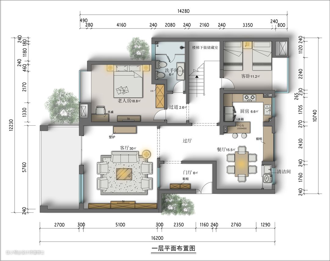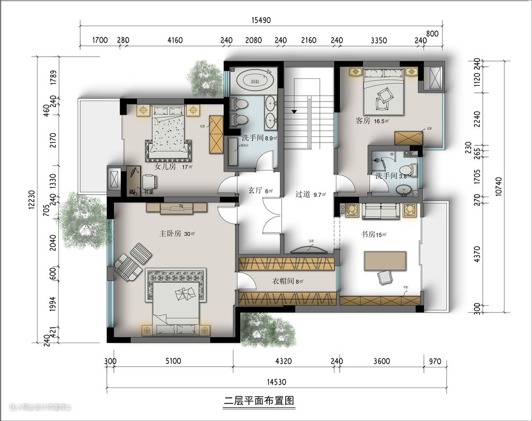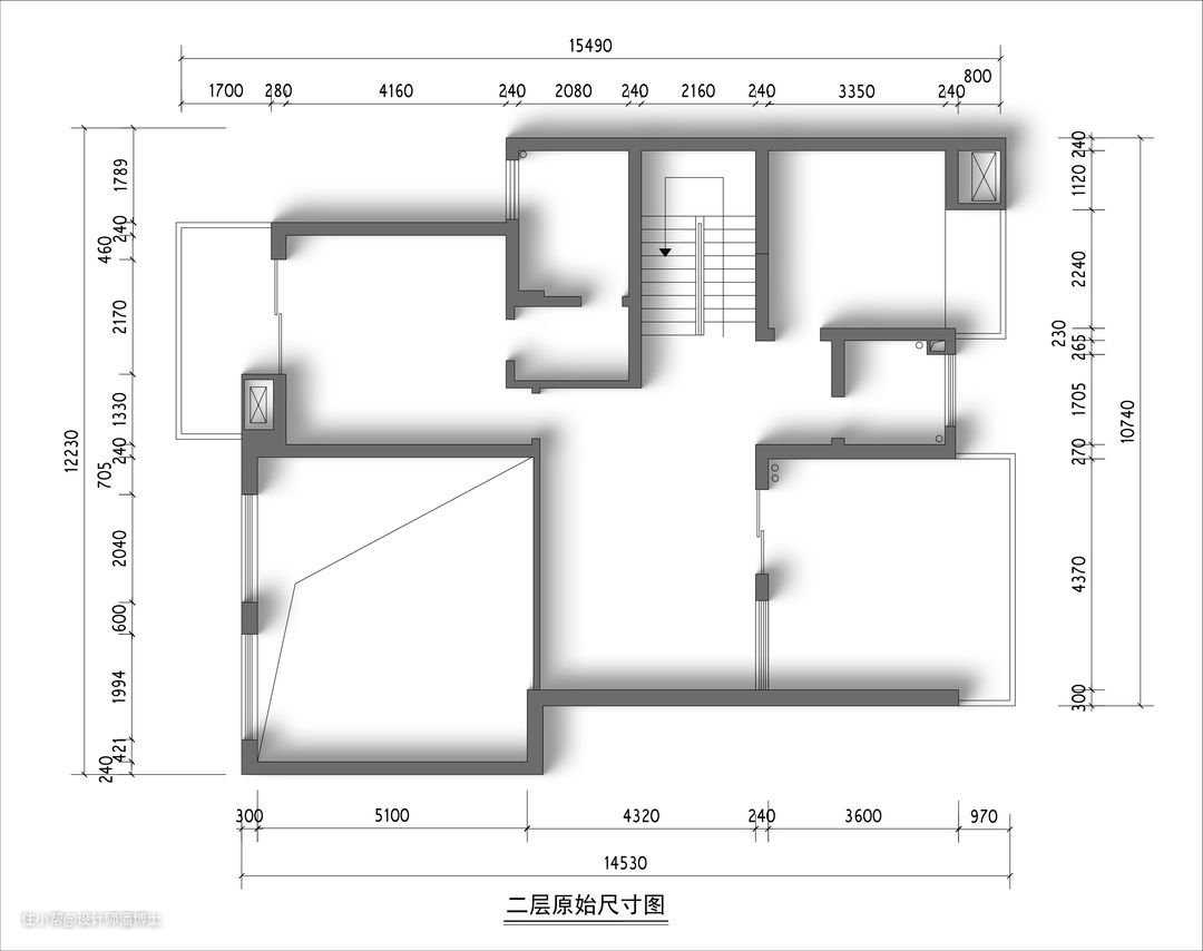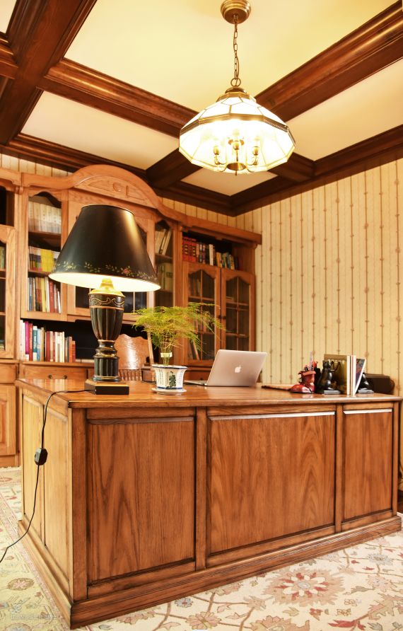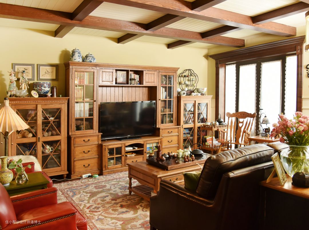 户型解析: 这是祖孙三代4口人居住的跃层公寓,原平面可用面积是200平米,客厅挑空有6.3米,卧室4间,厨房空间狭窄,南面有两个露台,北面有一个面积很大的半露台。业主希望家庭成员都有自己足够独立的私人空间,储物空间要充分考虑;原入户没有私密性的问题要改善,同时要保证有自然采光;对餐厨空间的要求是要足够大,容纳下一家人和朋友聚会。于是在原建筑大多数结构墙体不可拆打的条件下,在客厅上面搭建了一间卧室;北边半露天封闭四分之三的面积做了书房;因原厨房面积太小,选择做了开放式厨房,把厨柜向餐厅延展,增加餐厨操作面积;原餐厅外面不足2平米的空间做成了独立的洗衣区,将热水器和洗衣机都隐藏了起来。原平面的入户没有隐私性的问题用落地玻璃窗和隔断墙围合出独立的门厅,光线透过玻璃从客厅大露台投射过来,解决了采光问题,地面低于客厅5厘米也起到防尘的作用。 业主对东西方传统文化的热爱最终决定了整屋风格是一种融合混搭的复古风,深色木梁与地板都刻意强调了木纹的自然纹理表现,白色半高的实木墙裙是怀旧的样式,配合的线条却是简洁利落的。主体上选择朴拙质感的实木美式家具,有着纯粹的乡村血统,厚重的门套结构又强调了这一点,定义整屋风格在结构上的硬朗气质;搭配不同风格的软饰,融合了不同文化和时期的器物,塑造了一个带着灵性与故事的家。