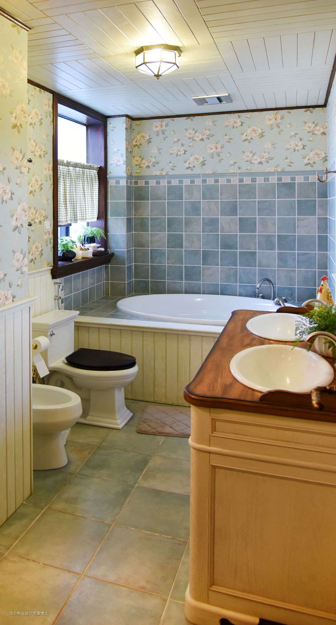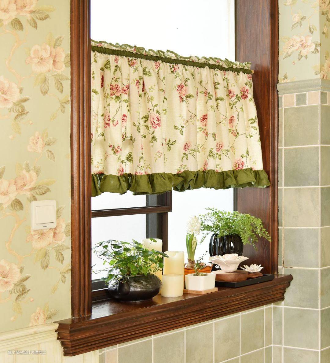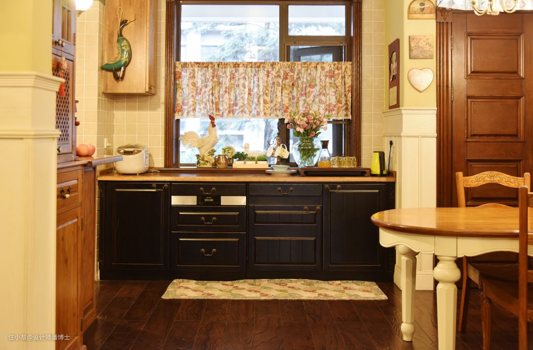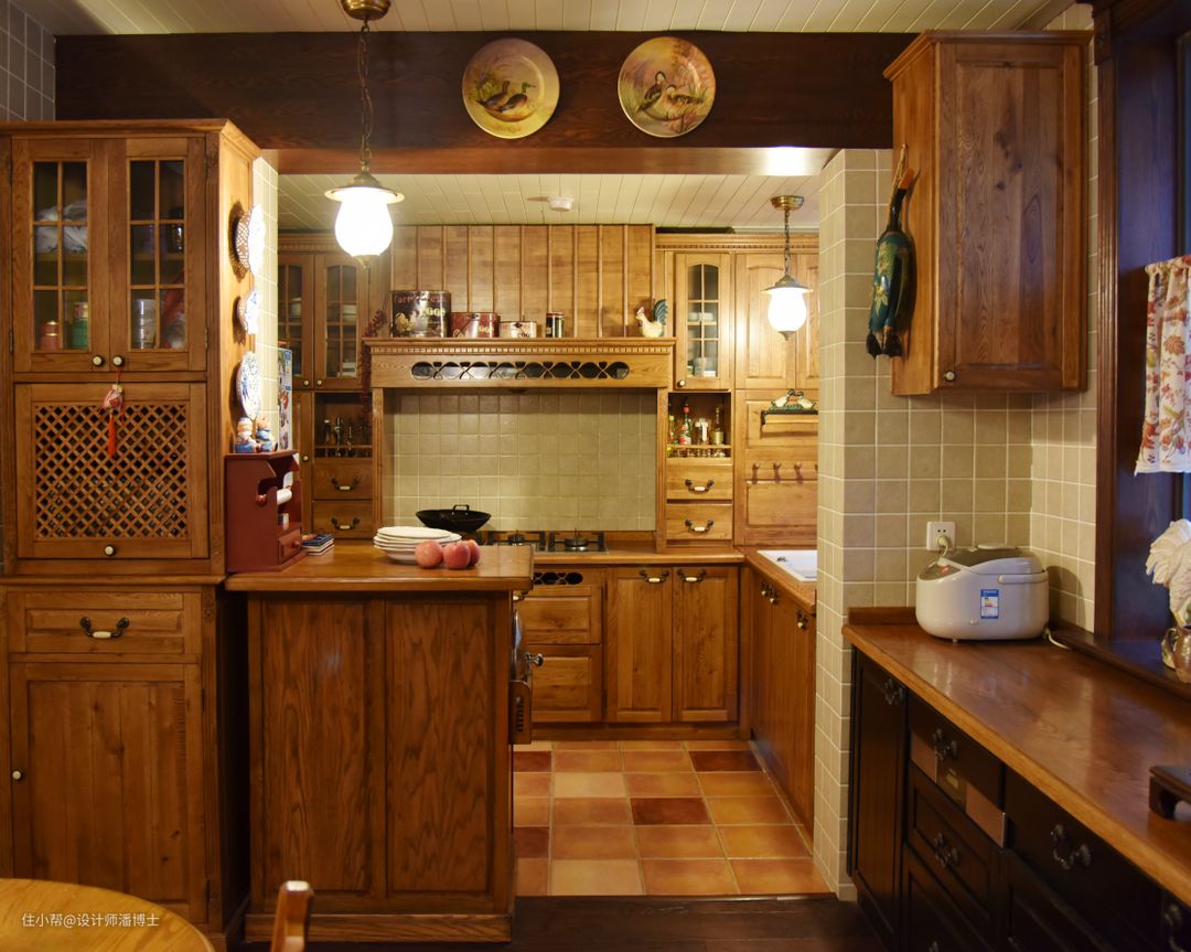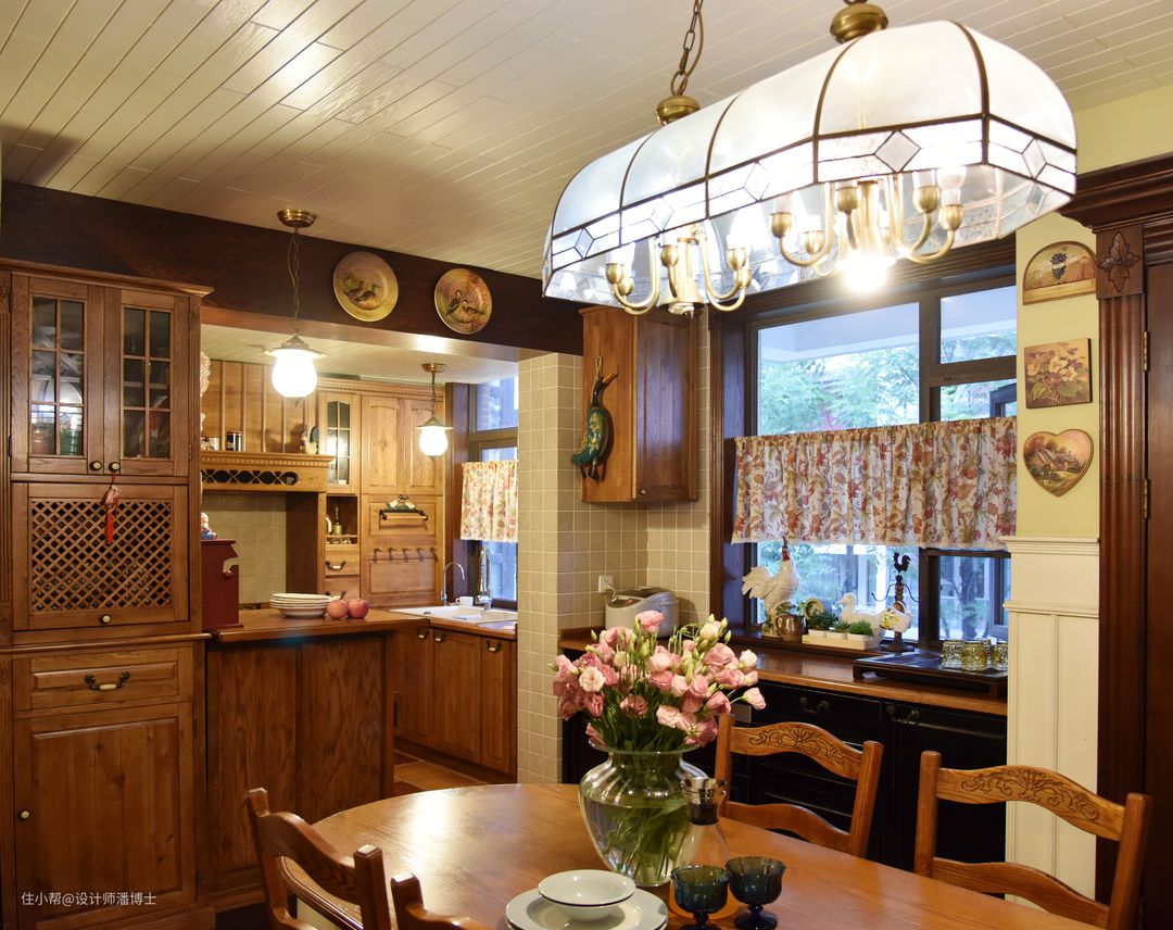 定制的美式乡村厨房和半岛,乡村风格表现突出。美国红橡涂装栗色的木蜡油,台面没有采用传统石材,都是整木制作,木蜡油涂装后的台面保证了实木质感的朴素自然,而且还耐脏抗污。 包围式的抽烟烟机罩让开放式厨房彻底省去了油烟乱跑的担忧。窗台上的丰富的器物和植物,墙上漂亮的挂盘,挂画,都为这个餐厨空间增加不少乡村田园的风味。