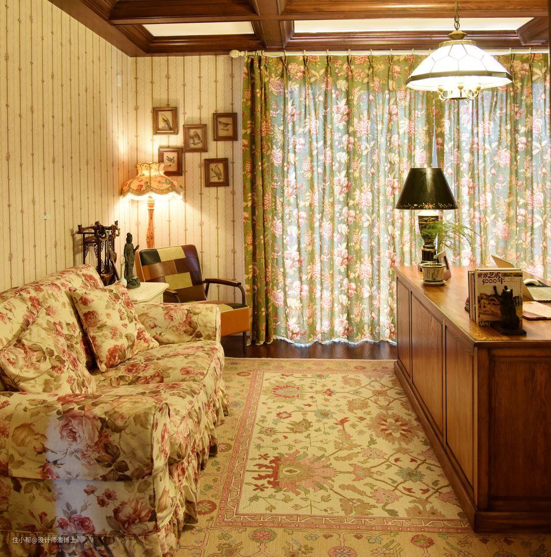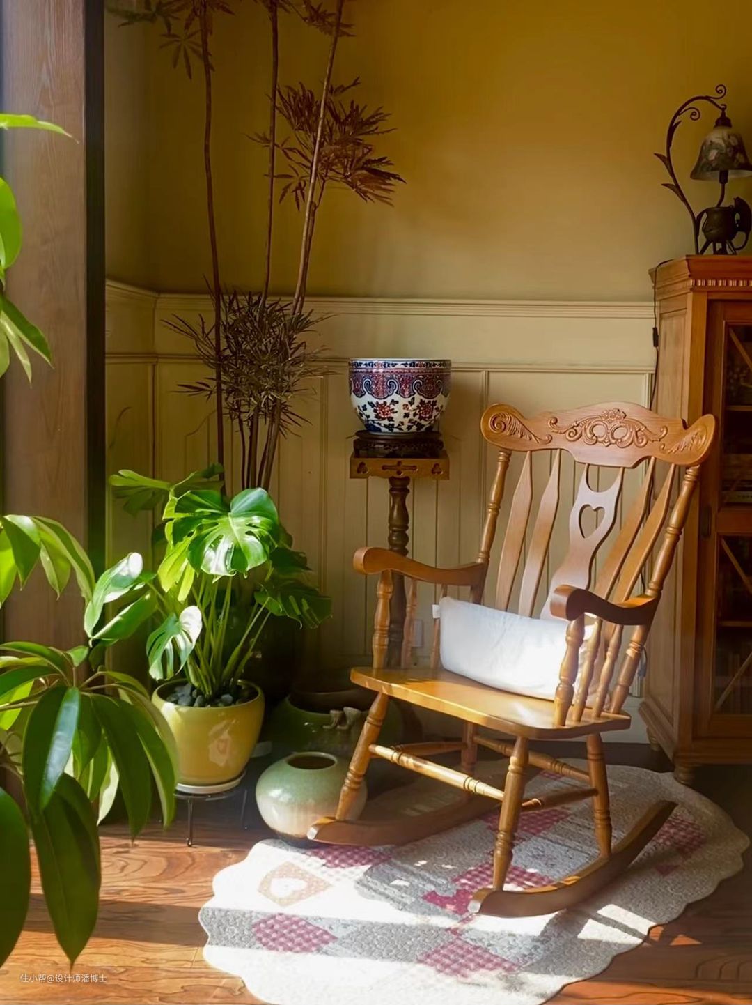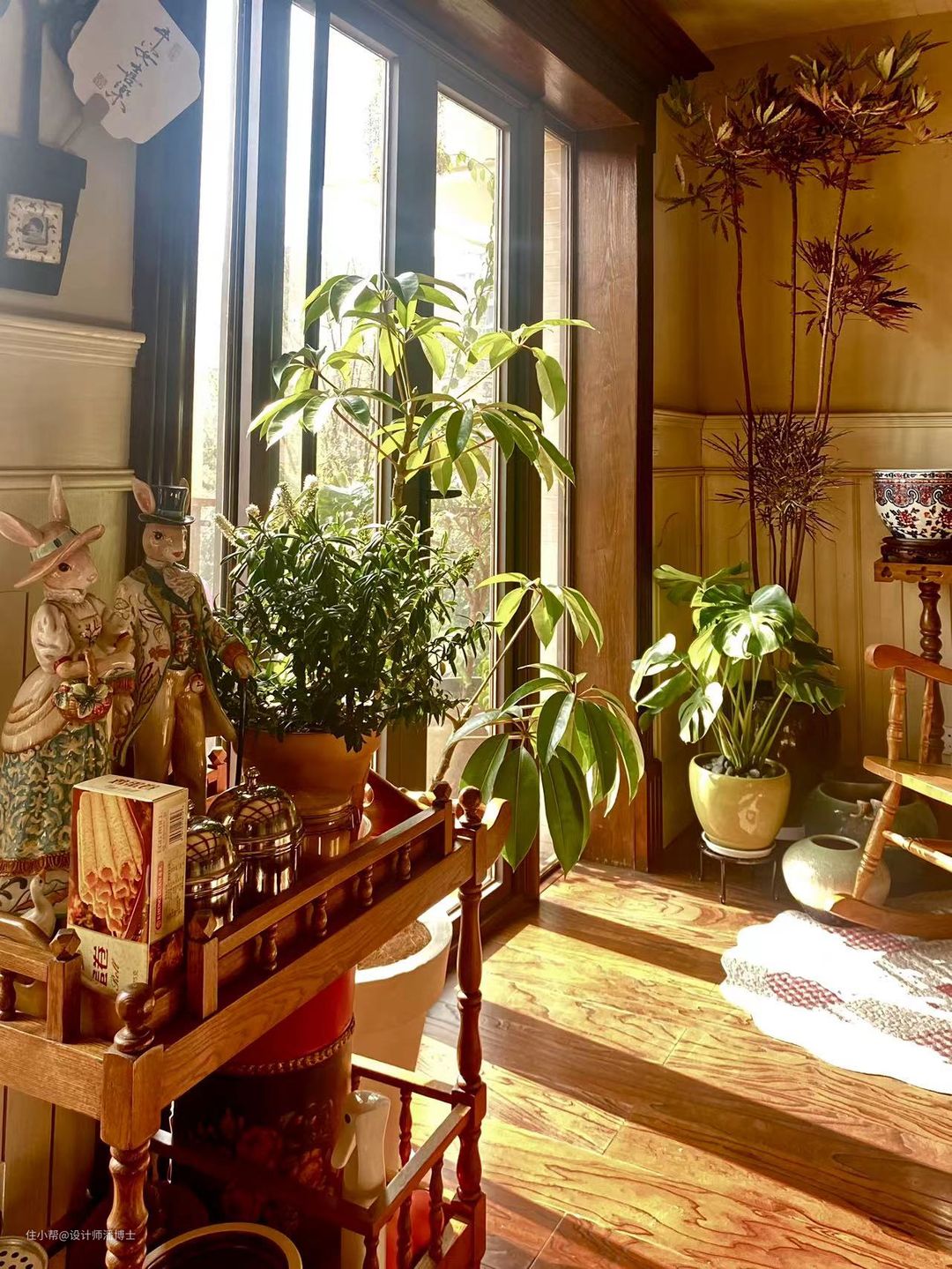延续了整屋混搭气质的书房,厚重且板直的实木梁,红橡木的原木书橱书桌,做旧风格的布艺沙发和墙纸,粗羊毛编织的尼泊尔地毯,围绕着复古气质展开的所有细节都是主人用心的选择。