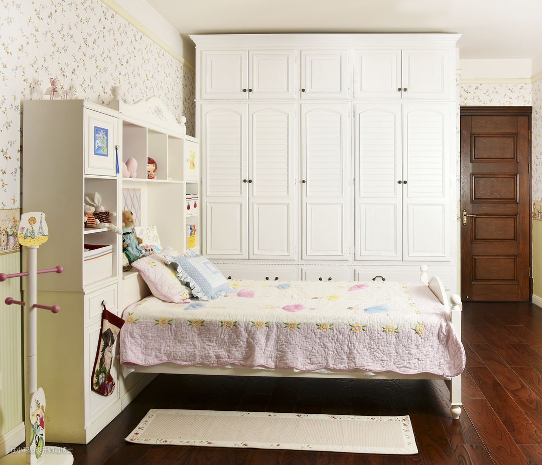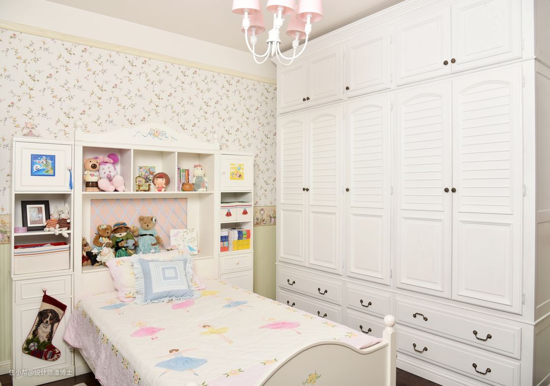 女儿房清新田园风格区别于别的房间,轻松明快的色彩,活泼的配饰,全然是小女孩独立自主不受拘束的体现。藤蔓与花园主题的墙纸和窗帘,定制的实木书桌有着非常好看的复古绿,这样一个童年的空间让人印象深刻。