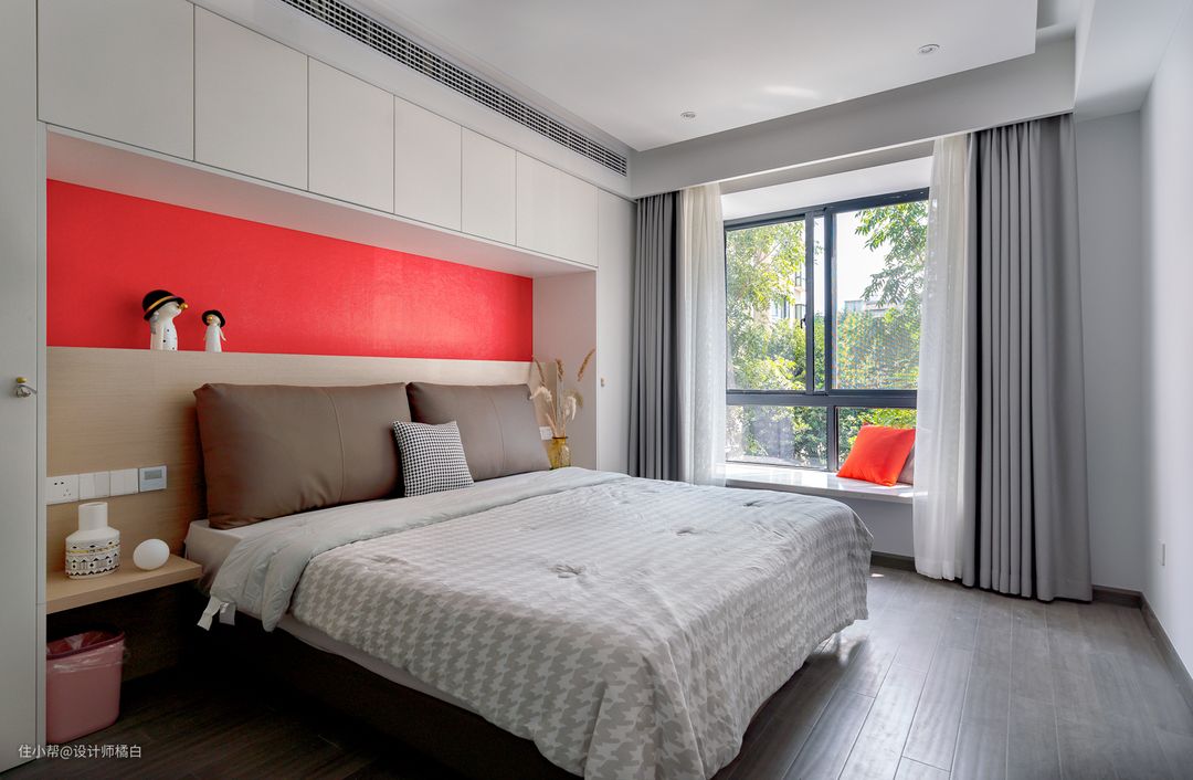 主卧的床头背景墙别出心裁,将美观与收纳巧妙融合,一抹正红色打破浅色调的平淡,为空间带来更多浪漫的情愫。