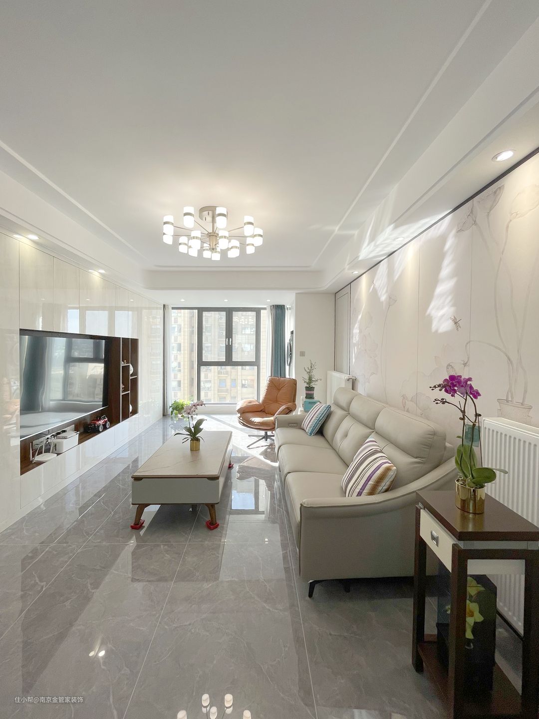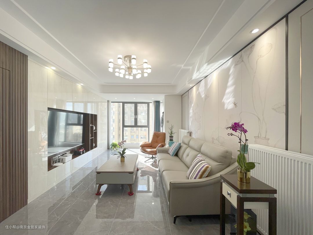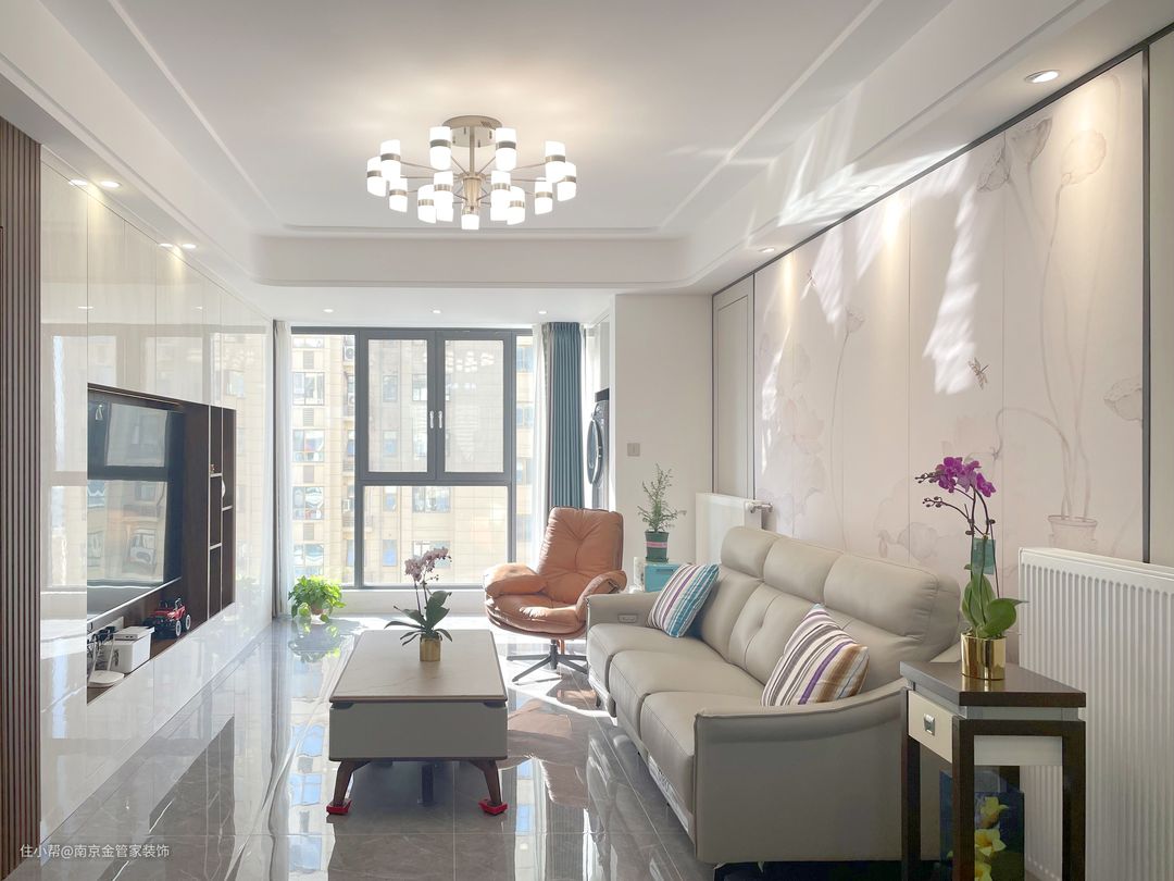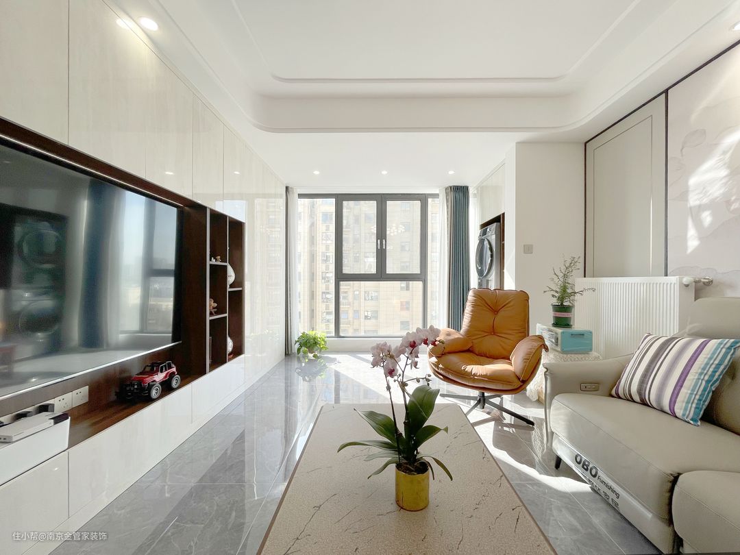 整个客厅以纯净的色彩作为基调,和谐统一,从进入空间的刹那,视线毫无阻隔,大面积的白让空间呈现出干净通透的视觉效果,时尚又大气。