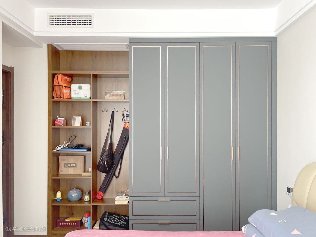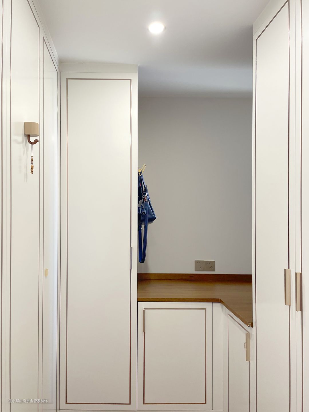设计师将进门转角处设计成衣帽间,不同高度的衣帽收纳柜组合,转角处还设计了台面,业主喜欢闲暇时放上软垫,坐着这里阅读、观影,享受一个人的独处时光。
