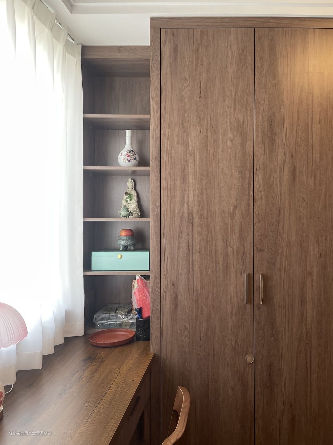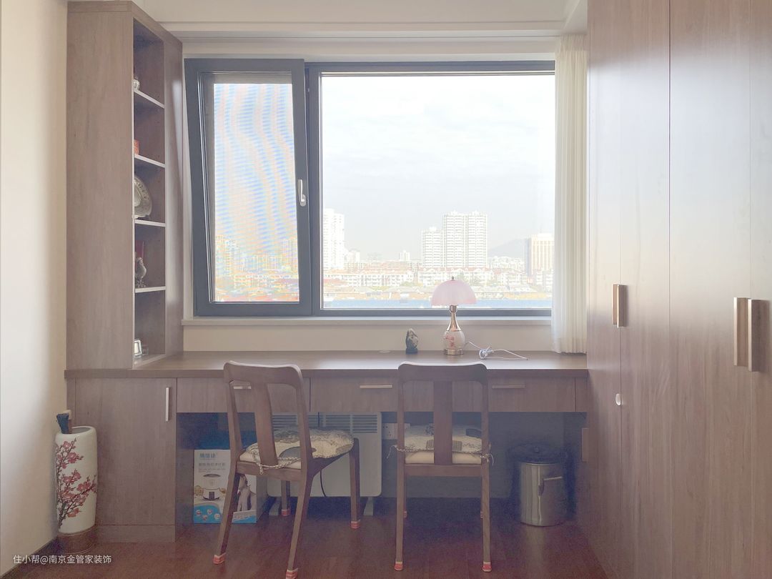 书房整个空间以木质元素构建,木头质感的装饰收纳一体柜具有一种远离喧嚣的气息。