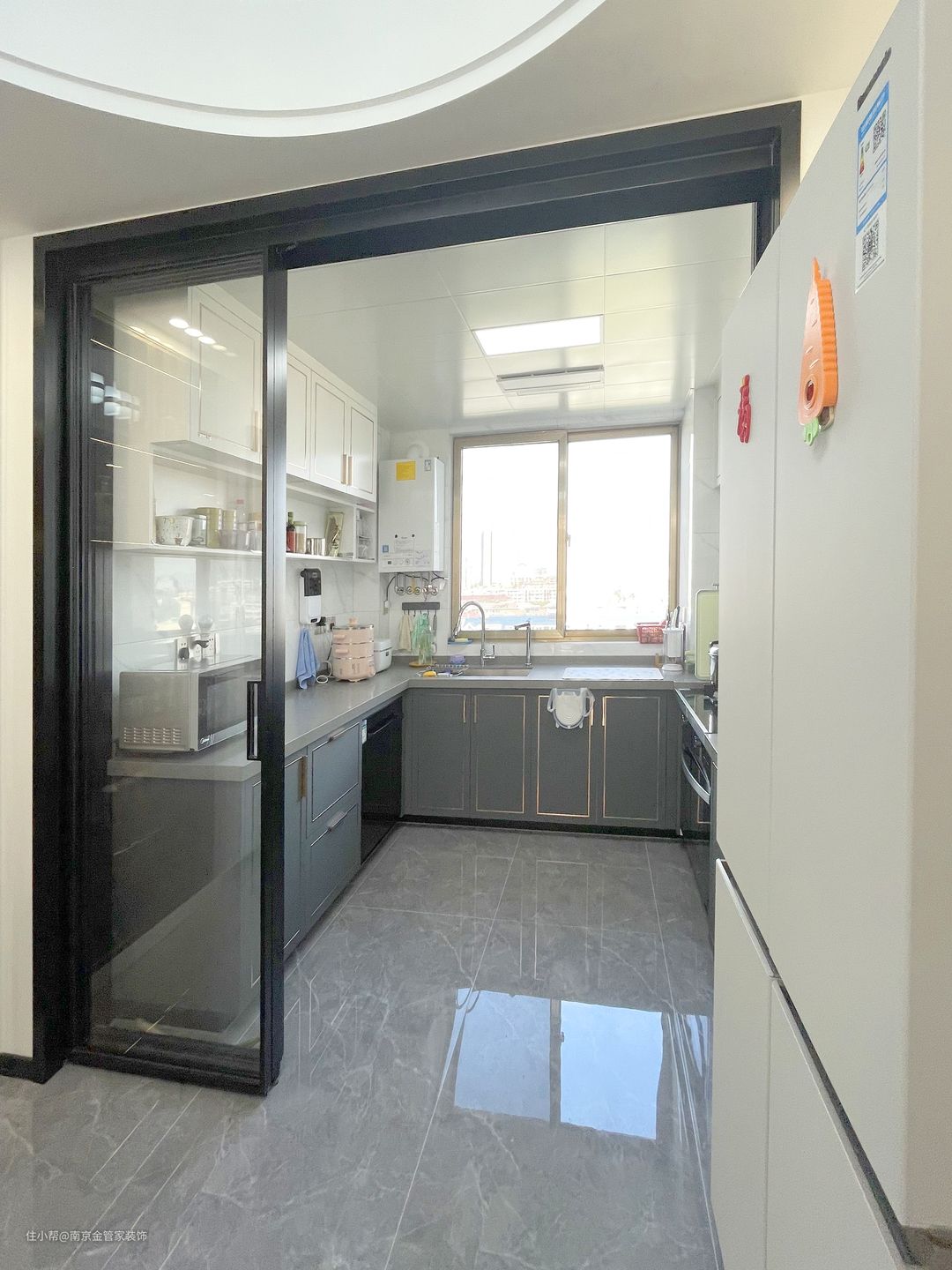 餐厅与厨房之间设计“共享”的大面积玻璃移门,餐厅、厨房之间利用玻璃门做隔断,不影响整个家的采光通风,空间面积在视觉上增大了很多,也增加了室内空间的采光性与通透感。
