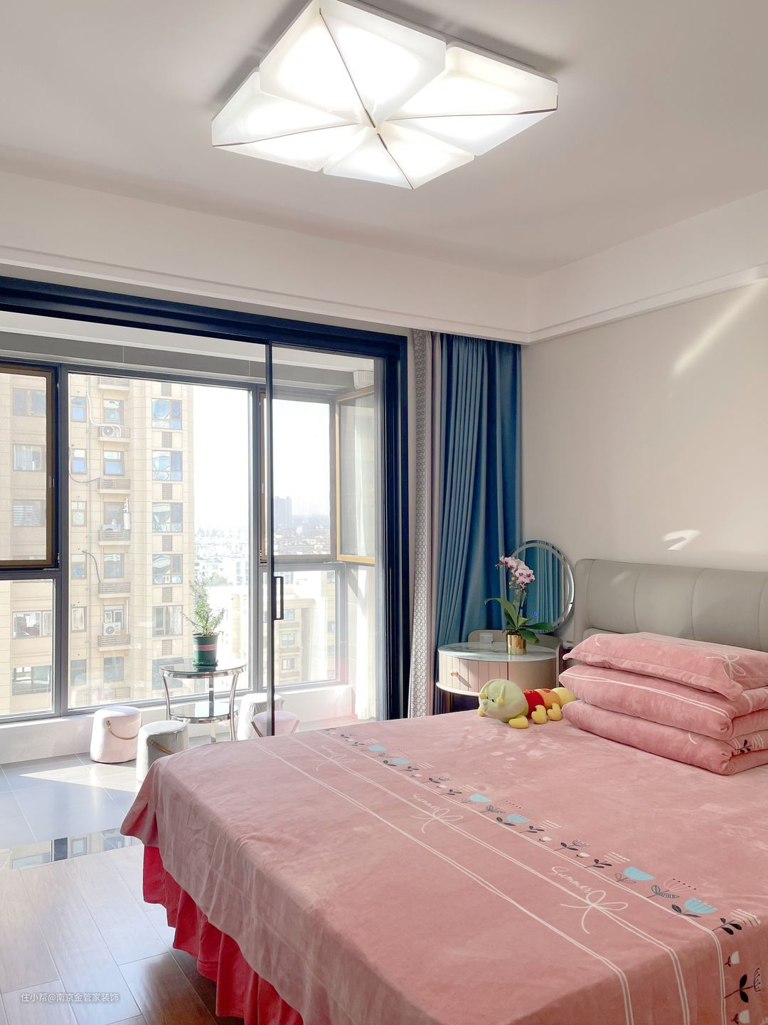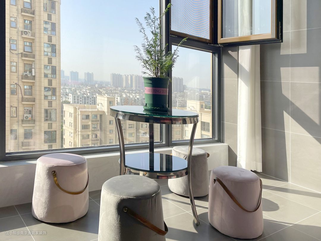 阳台搭配了一套布艺沙单人凳,与金属圆形双层置物桌相搭配,简约圆润的造型,有种包容、大度的感觉,温柔低调的色彩端庄优雅有充满潮流感。