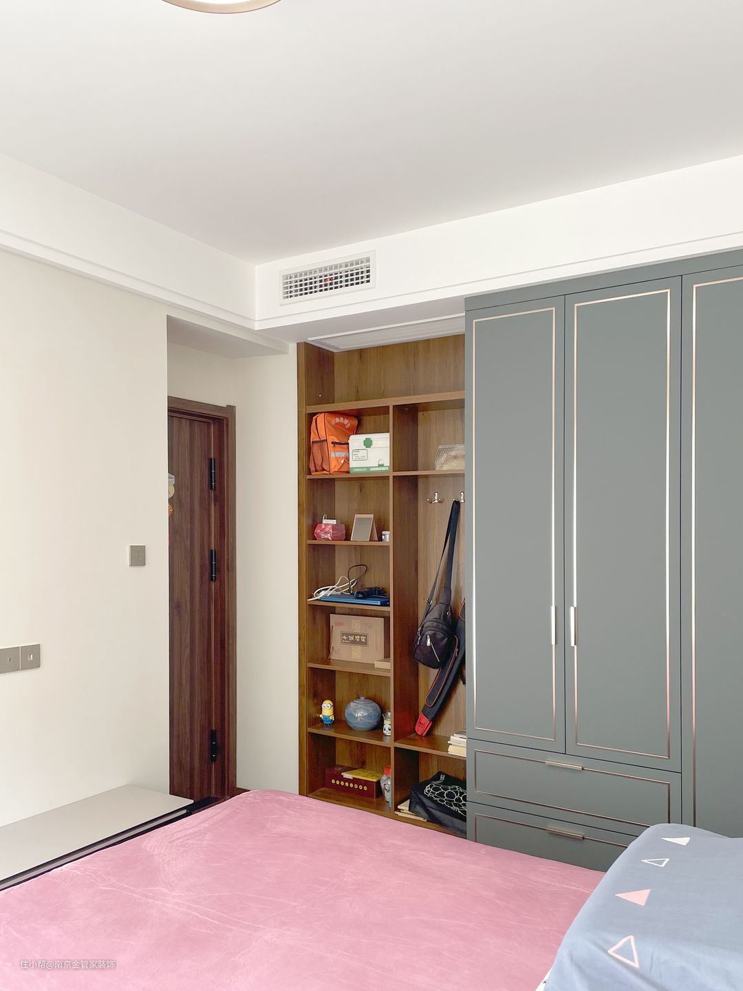 门后的区域设计成收纳格组合,既不影响开关门,业主的小物品都能拥有“容身之所”,美观又实用。