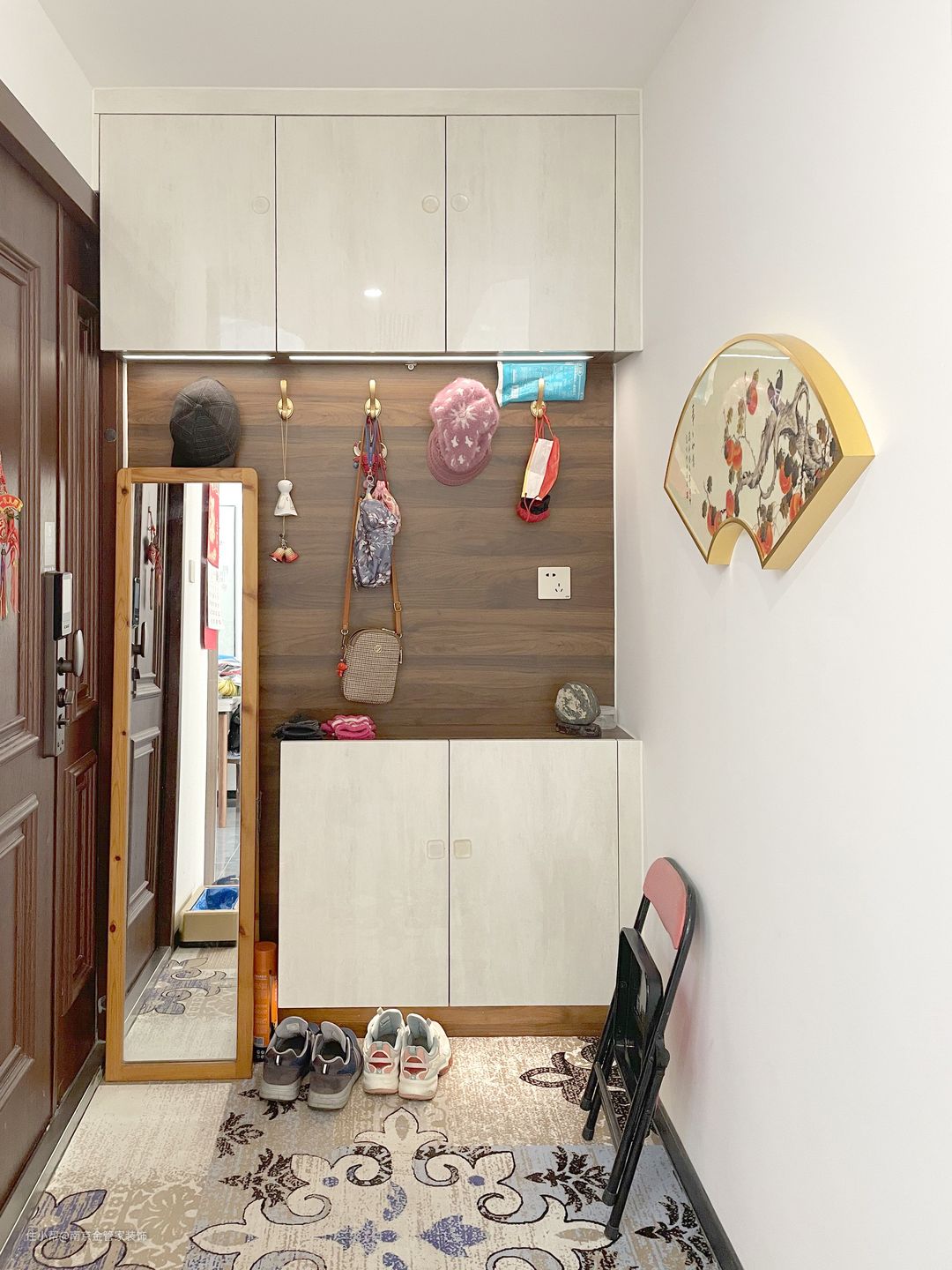 新中式风格呈现出一种端庄典雅又现代时尚的感受。进门处玄关区域设计整面护墙板,上下均设计收纳柜和鞋柜,中间位置留出来,粘上粘钩,用来挂帽子、包包等。