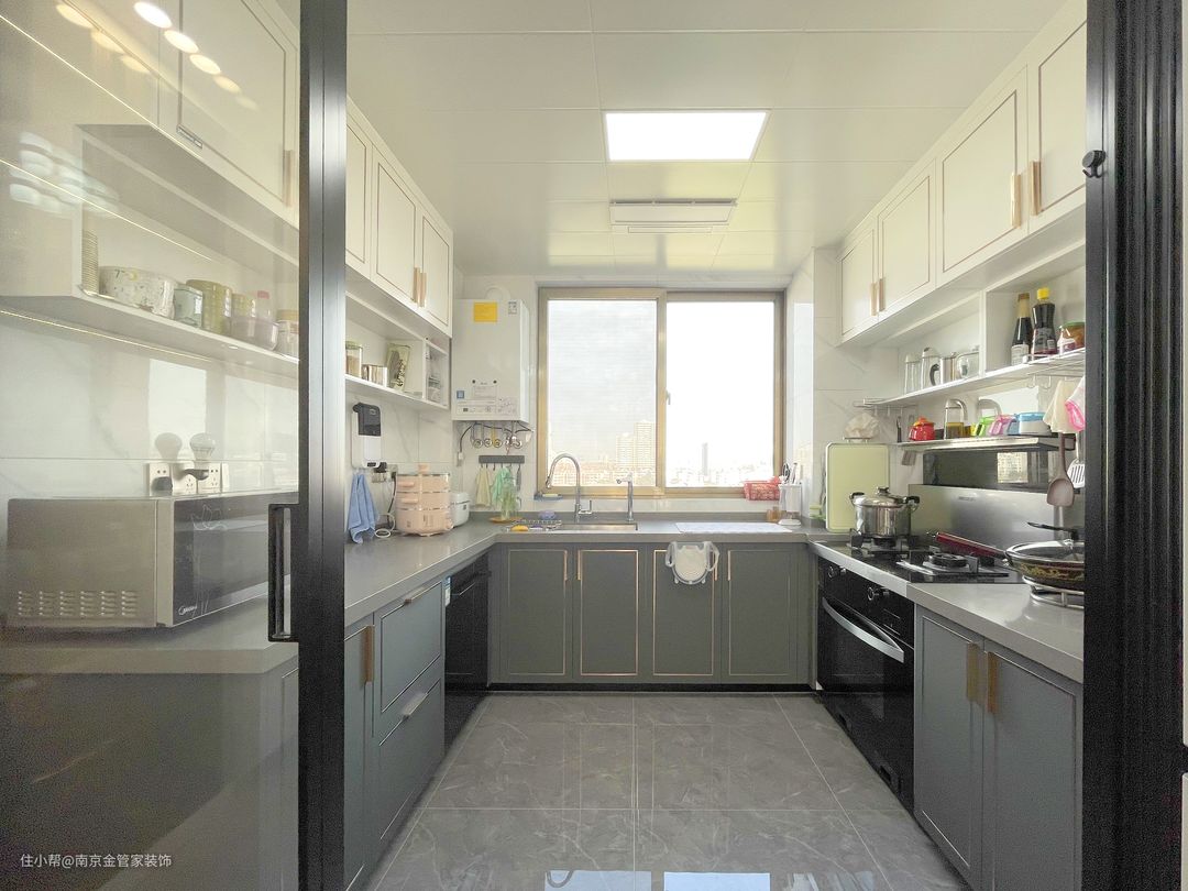 厨房空间以白色和橄榄绿为主色调,干净清爽。U形橱柜设计,让厨房动线布局更为合理,既实用又美观,不会造成空间浪费。