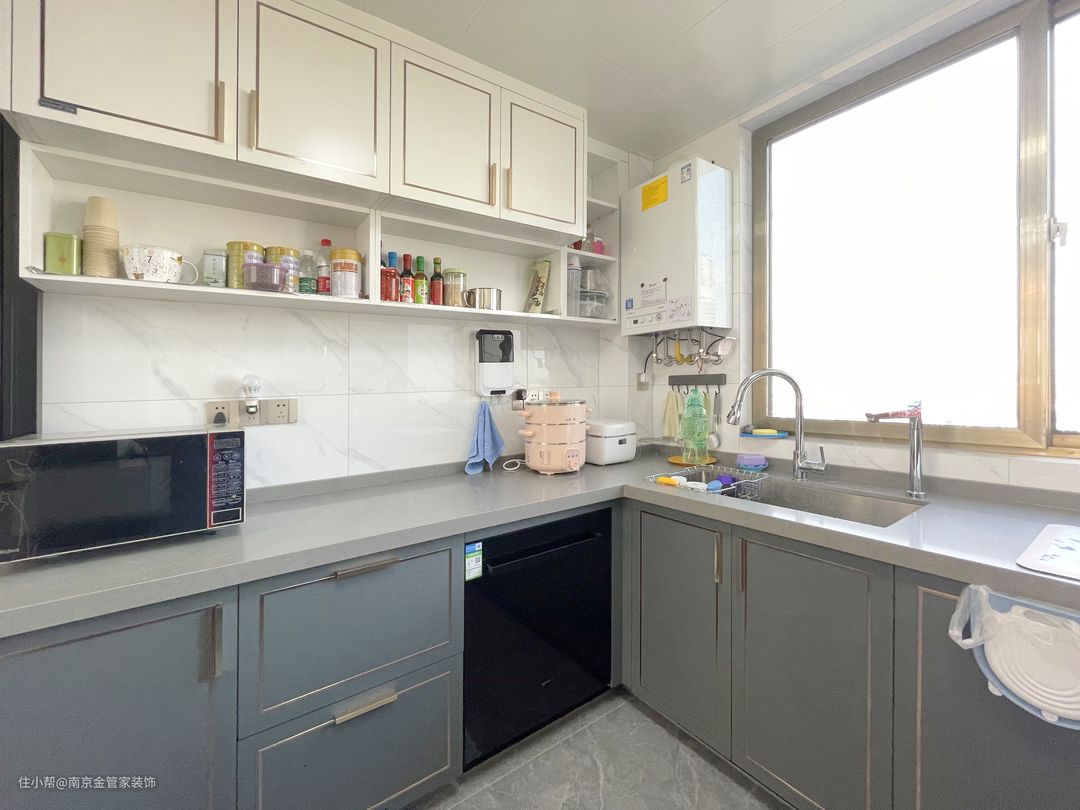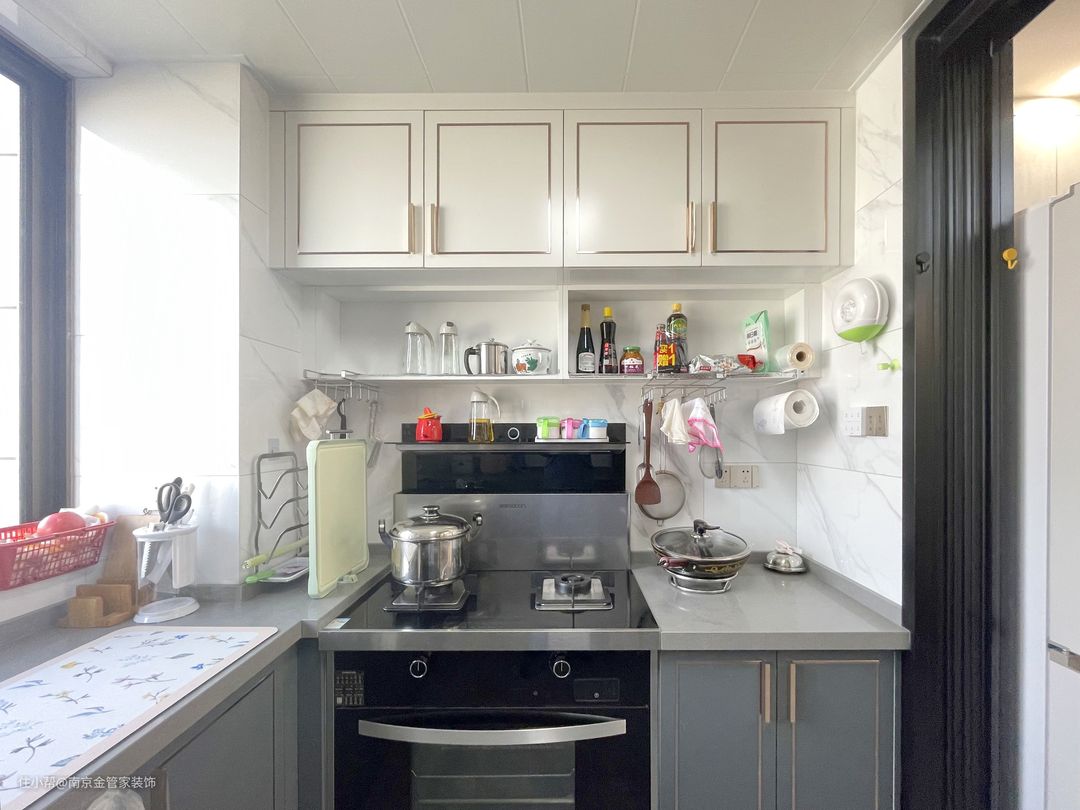 为了增加收纳功能,厨房设置了与整体空间风格统一的白色墙柜,一整排的悬空白色墙柜设计弱化了正面墙柜带来的沉闷感,反之,更加通透敞阔,同时又很好的满足了厨房用品的收纳需求。