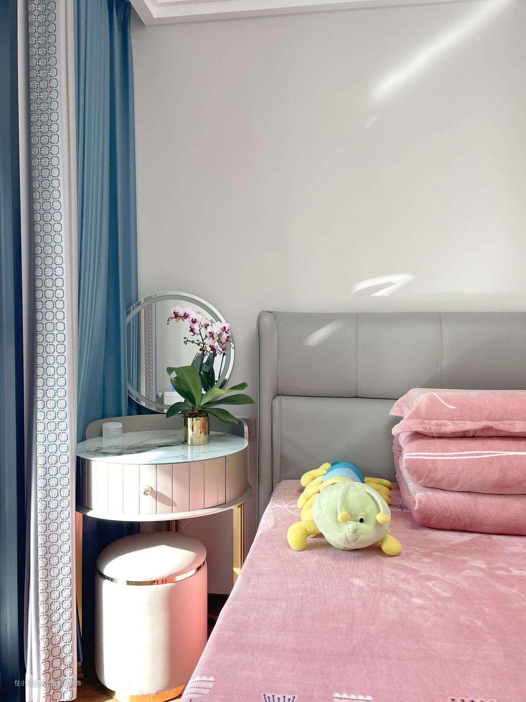 卧室的一角选用了一款乳白色的梳妆台,小巧而精致的造型为空间带来了素雅时尚的感觉。搭配绽放的花束,闲的格外温柔细腻,体现出女主人优雅细腻的情感。
