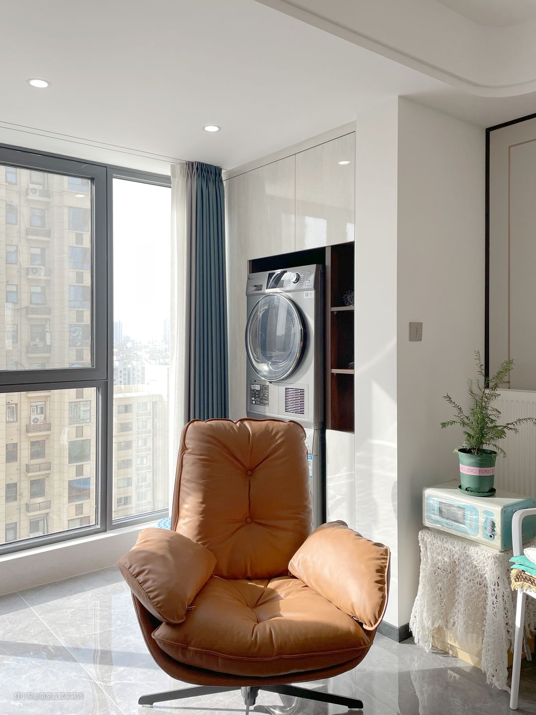 阳台区域设计成洗衣房,放置洗衣机和烘干机,上方和侧边设计收纳柜,简洁好看又实用。