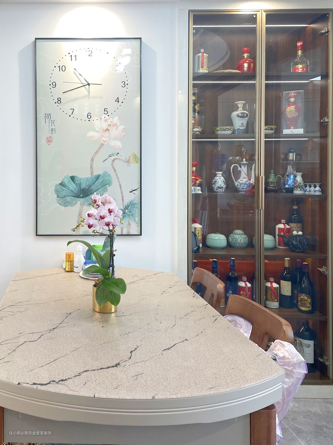 餐桌旁边的墙面挂上荷花的装饰画,整体风格统一,让空荡的墙面充满生机。