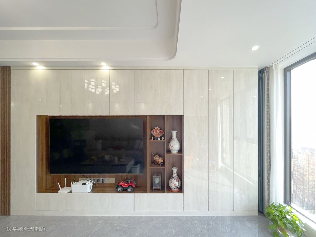 客厅电视背景墙抛弃了传统电视柜做法,而是把电视柜和背景做到了一体成型,是收纳柜、电视柜、护墙三种功能的集合,形成视觉轻便而功丰富的多功能系统。