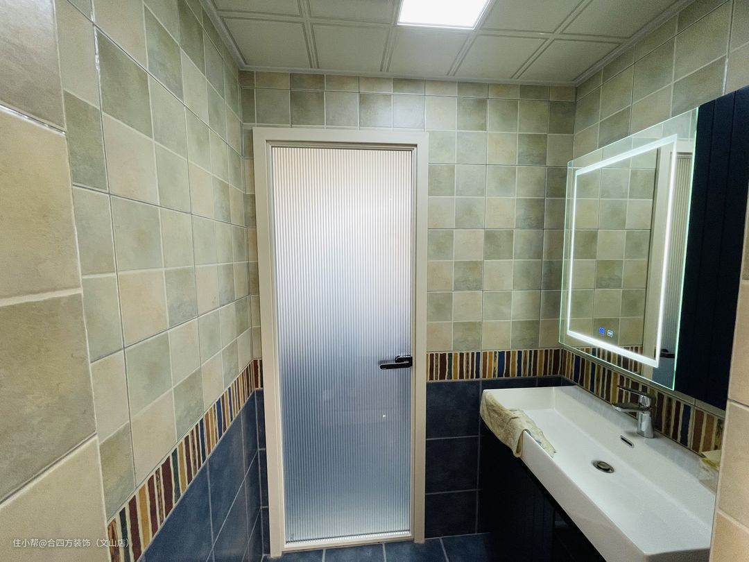 卫生间的设计相对简单,一扇彩虹玻璃门,墙上瓷砖中间做了腰线,上下瓷砖一分为二,上面深浅格子,下面蓝色让,整体层次丰富。贴合房主的需求,卫生间只预留洗漱台和马桶,突显出淋浴区的使用面积,简洁中也让浴室空间变大。