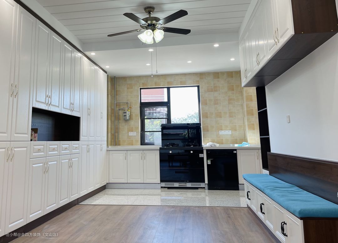 再看将看点放在厨房,方位很正的厨房,采用u型布局,除了保证烹饪流程顺畅以外又增加了两边的一体柜,收纳性极强。右边的地柜还可以当休息区,是一种很新引的设计方式。