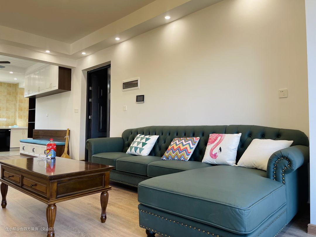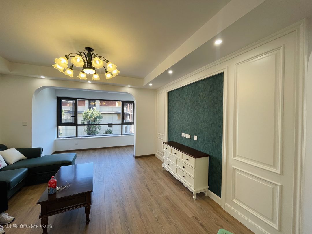 客厅的主色调为米白色,吊顶做了边吊的形式加上射灯作用,使空间变得规整、美观,充满温馨。在看背景墙的部分,米白色的护墙板加上复古绿暗花,搭配一个欧式复古电视柜,一整个气质有被瞬间提升起来。 家里的装修在于硬装与软装结合,同为复古绿的沙发和背景墙一致呼应,视觉上拉满欧式的华贵。
