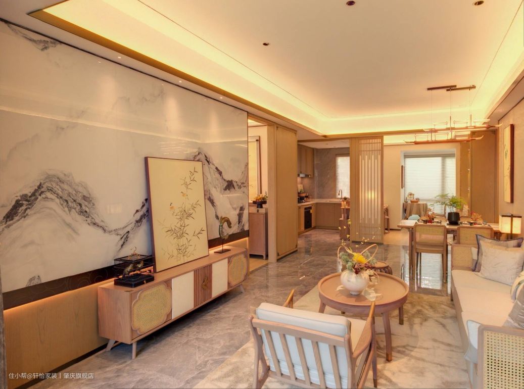 客餐厅一体化设计,不仅保证了空间和视觉的和谐统一,还让家居空间的设计了更连贯,视野更开阔。空间家具的原木风格,让客厅多了一抹素雅的既视感,地面通铺灰色的亮面瓷砖,让空间更敞亮,并有轻奢的质感。 空间无主灯设计,视觉上减少了阻碍,整体看起来更通透,同时筒灯+灯带设计,让空间的光源有了层次感,营造氛围舒适的居住空间。 客厅一字型的木架+布艺搭配的沙发,增加空间的温馨感,在搭配木质的茶几和圆凳,给人带来自然淡雅的视觉效果,沙发背景墙上张贴的竹子墙纸,让整体空间营造出一种宁静致远的感觉来。 客厅做了去电视化设计,一字型的古韵电视柜摆放在那,不仅增加空间的收纳,水墨画的大理石电视背景墙,更是提升空间高级感的绝佳点缀。