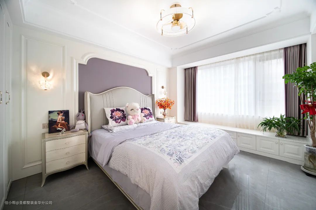主卧以温柔的紫色为主色调,营造柔和宁静的睡眠空间。淡雅的色调更有助于释放压力,暖白的柜体,打造出了恰到好处的质感。