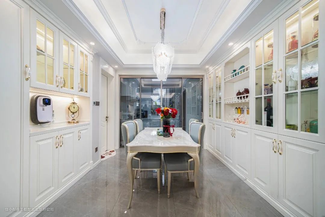 浅色系的餐厅色调给人轻松的感觉,在水晶吊灯柔和的灯光下,显得格外温馨和谐。两侧的收纳柜实用性十足,日常的藏酒、水具摆放其中,一同营造雅致惬意的生活氛围。