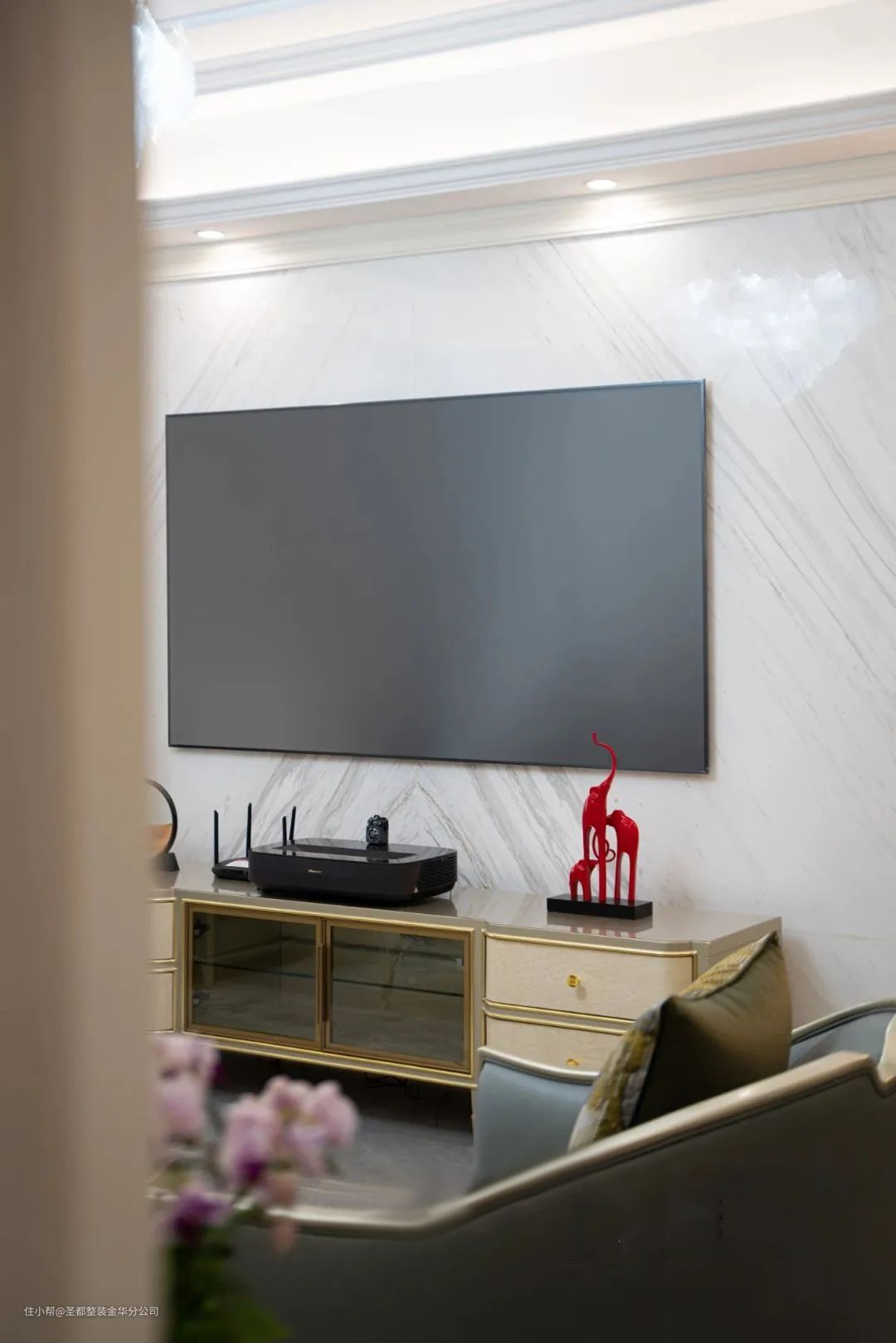 进门首先引入眼帘的是充满自然风情的热带雨林背景墙画,以大自然作为创意灵感,将一方雨林织于家居之中,打造东南亚风情“乌托邦”。让家居回归自然,幻发勃勃生机,收获深沉而又平静的力量。客厅沙发区,温润的美式家具配上美式简约线条护墙板,真的是非常耐看。舒适的蓝色沙发搭配浅色的大理石茶几,温润又雅致。在水晶灯和绿植的点缀下,整个空间温暖又醇厚。 电视背景墙设计的比较简单,就是简单的大理石墙面,左右两边用精致的美式护墙板对称装饰,整个空间简洁又时尚。 在单人沙发里,享受片刻的安静和舒适,喝喝茶、看看书、玩玩手机,或者简单地发个呆,都是最好的充电方式。