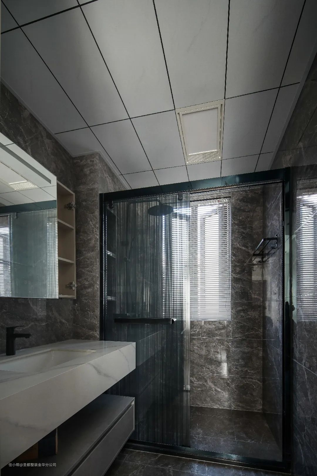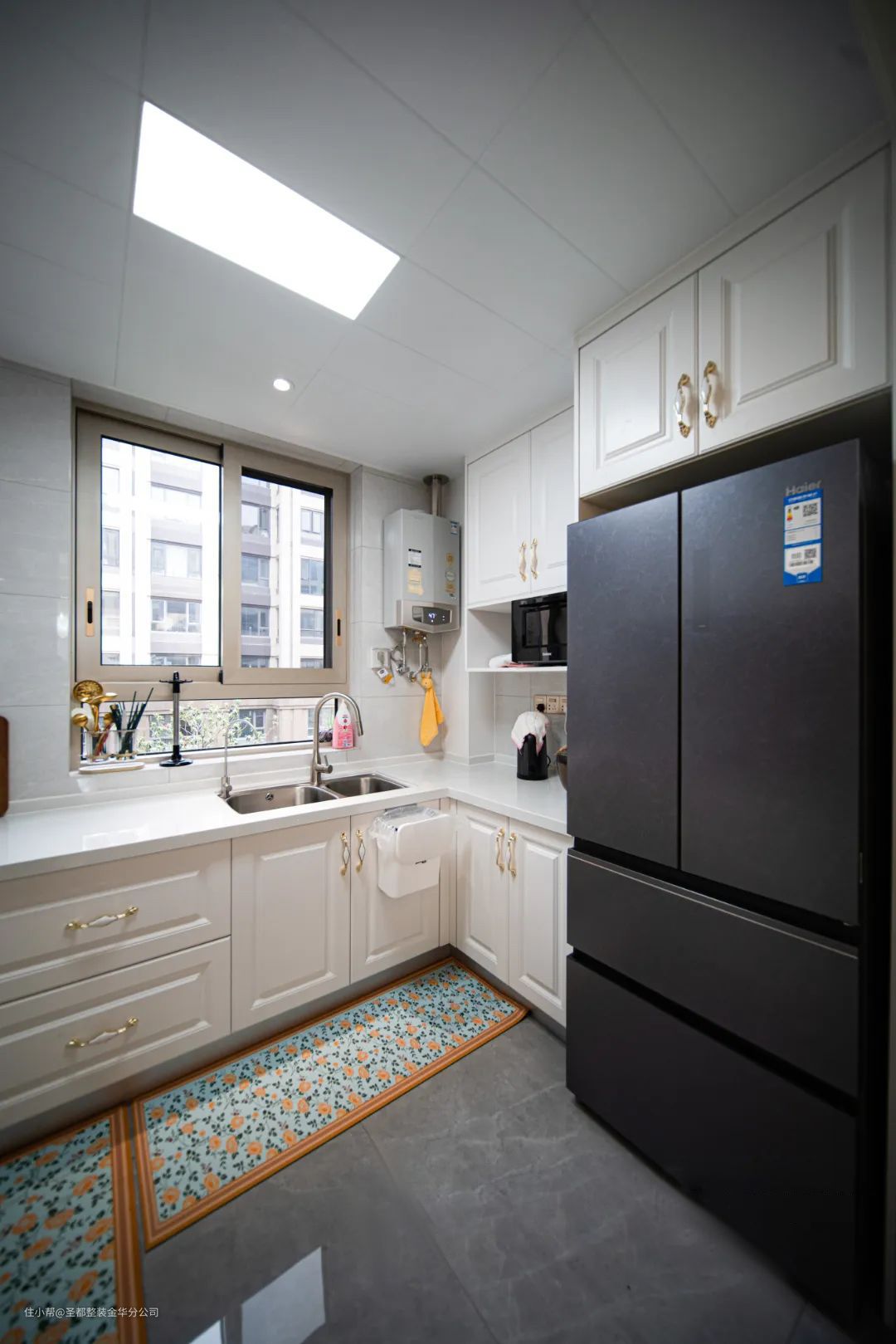 餐厅设计与客厅是相通的,中间以玄关厅作为隔断,三者合而为一,让家居空间得到最合理的利用,显得既宽敞又舒适。厨房空间白色柜体与灰色地砖搭配,既明亮又有整洁感。这里是体现家温度的空间,所谓人间烟火,至味清欢。