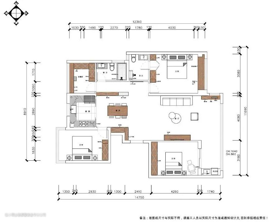 本案房子的风格布局是女主人喜欢的美式,整体温馨舒适、优雅大方。在各种材质的交错变化中,带出了层次的丰富感,整体环境的氛围加上巧妙的收纳设计让居住空间的机能与美感都兼具了。 1.打破原有阳台格局,一半纳入客厅,增加客厅活动空间,一半规划为生活阳台; 2.将西北侧房间的墙体打通,作为衣帽间和书房使用,增加收纳功能; 3.随处可见的弧形线条柔和优美,减少空间锐度,舒展出丝滑柔顺的家居图景。